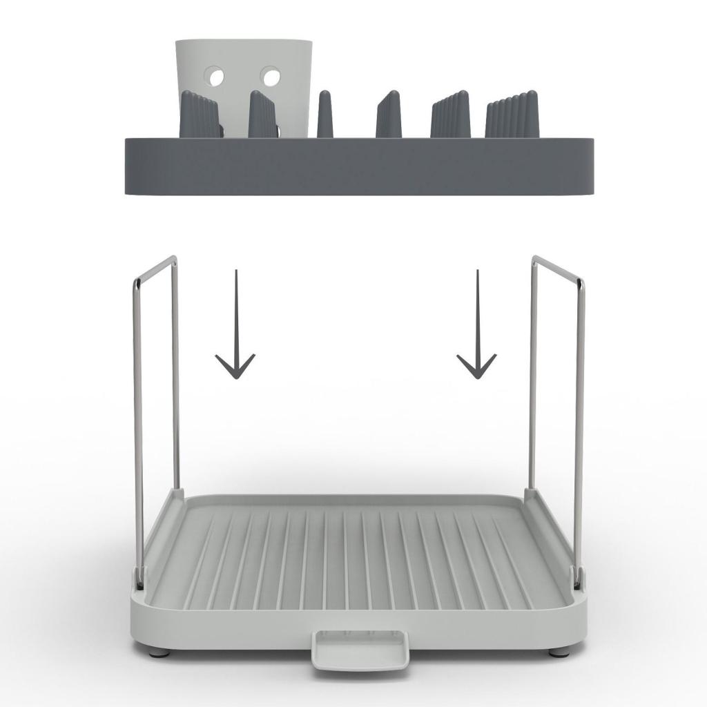- Die zweistöckige Lösung spart Platz in der Breite und erhöht gleichzeitig die Kapazität des Abtropfständers, ohne mehr Fläche auf der Arbeitsplatte zu benötigen.