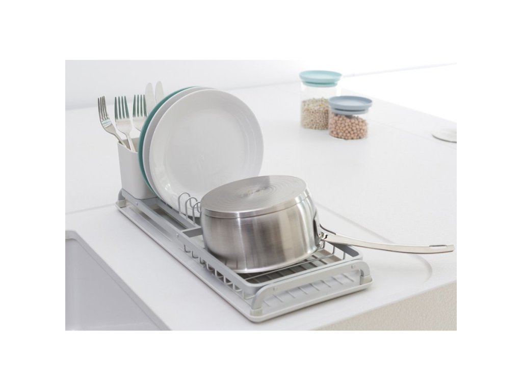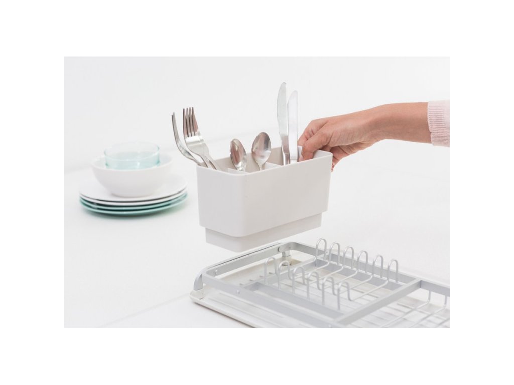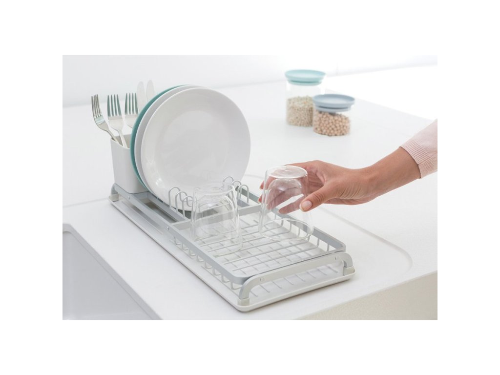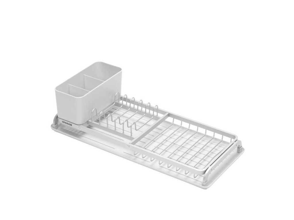 Der kleine Aluminium -Geschirrabtropfer Brabantia SinkSide bietet die perfekte Lösung, wenn Sie nur wenig Arbeitsfläche haben. Er hat ein elegantes Design, Platz für bis zu 5 Teller plus Besteck und Gläser. Er hat einen herausnehmbaren Besteckkorb und eine abgewinkelte Abtropfschale, so dass das Wasser direkt in die Spüle fließt.