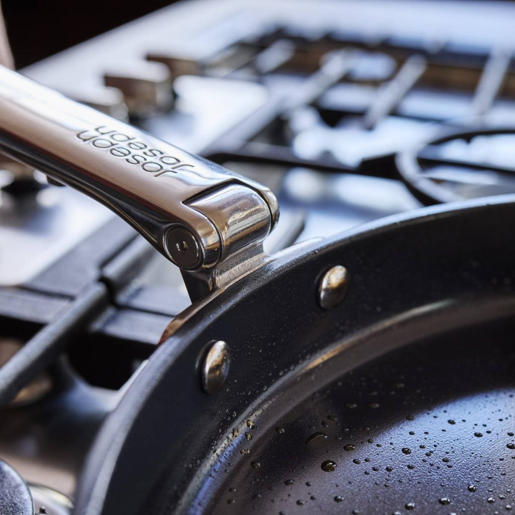 - Mit der patentierten SwingLock™-Technologie verfügt er über einen klappbaren Edelstahlgriff, der das kompakte Stapeln in Schubladen und Schränken ermöglicht.