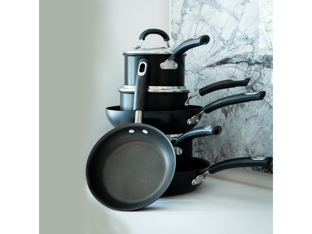 - Äußerst widerstandsfähige Pfanne mit Antihaftbeschichtung, die ein schnelles und effizientes Kochen auf allen Herdarten, einschließlich Induktion, ermöglicht