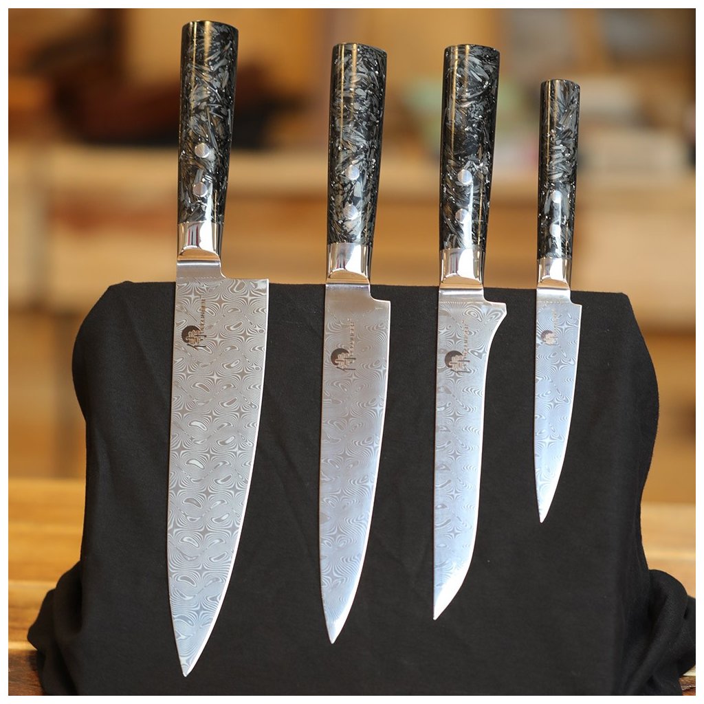 - die sorgfältig geschliffene Klinge ohne Kern besteht aus 110 Lagen zweier harter rostfreier und geschmiedeter Stähle und erreicht eine Härte von etwa 60 HRC