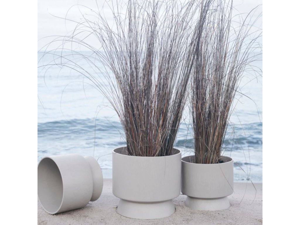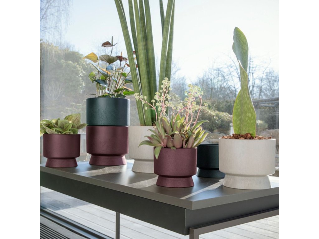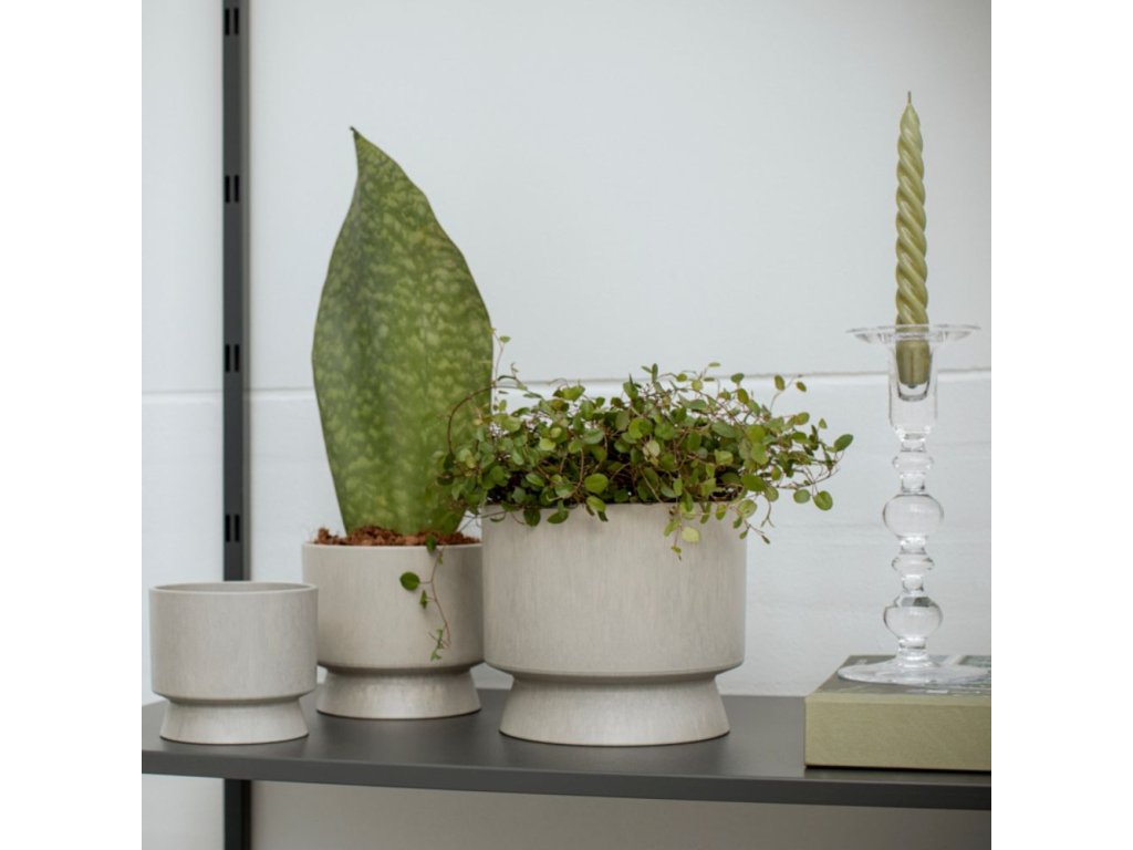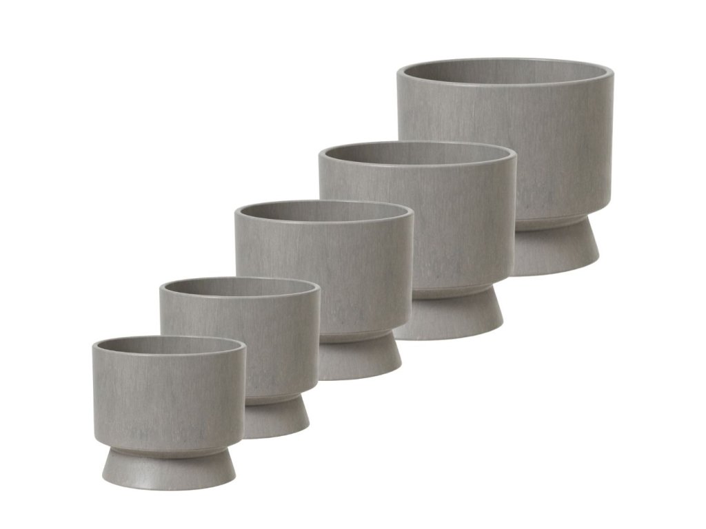 Die Töpfe aus der Kollektion sind in verschiedenen Farben und Größen erhältlich - hier in Hellgrau, Sandton und einem Durchmesser von 24 cm -, sind leicht, langlebig und frostsicher bis minus 20 Grad, so dass man sie drinnen oder draußen verwenden kann. Außerdem sind sie zu 100 % flüssigkeitsdicht, so dass Sie Flecken auf der Fensterbank vermeiden können (wenn Sie jedoch Abflusslöcher in den Boden machen wollen, gibt es Markierungen zum Selbermachen).