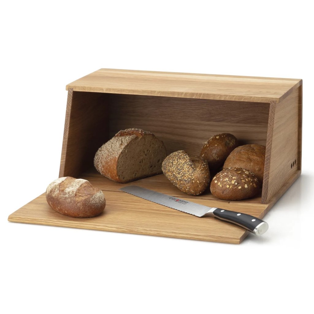 - der aufklappbare Deckel dient auch als Schneidebrett und ist groß genug für einen ganzen Laib Brot oder mehrere Brotsorten