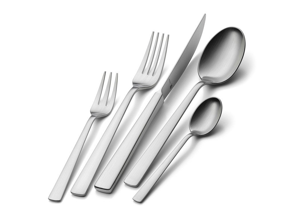 Corvo ist ein Besteck mit zwei Gesichtern. Das Messer kann auf zwei Arten ausgelegt werden, entweder liegend wie ein normales Messer oder stehend auf der Klinge. Bei der Herstellung des Messers ist das Design der Klinge identisch mit dem der Gabel. Wenn sie sich hinlegen, befinden sie sich mit der Gabel in der entgegengesetzten Position. Trotz seiner formalen Stärke liegt er sehr gut in der Hand. Die samtig-matte Oberfläche unterstreicht den Gesamteindruck dieses einzigartigen Bestecks.