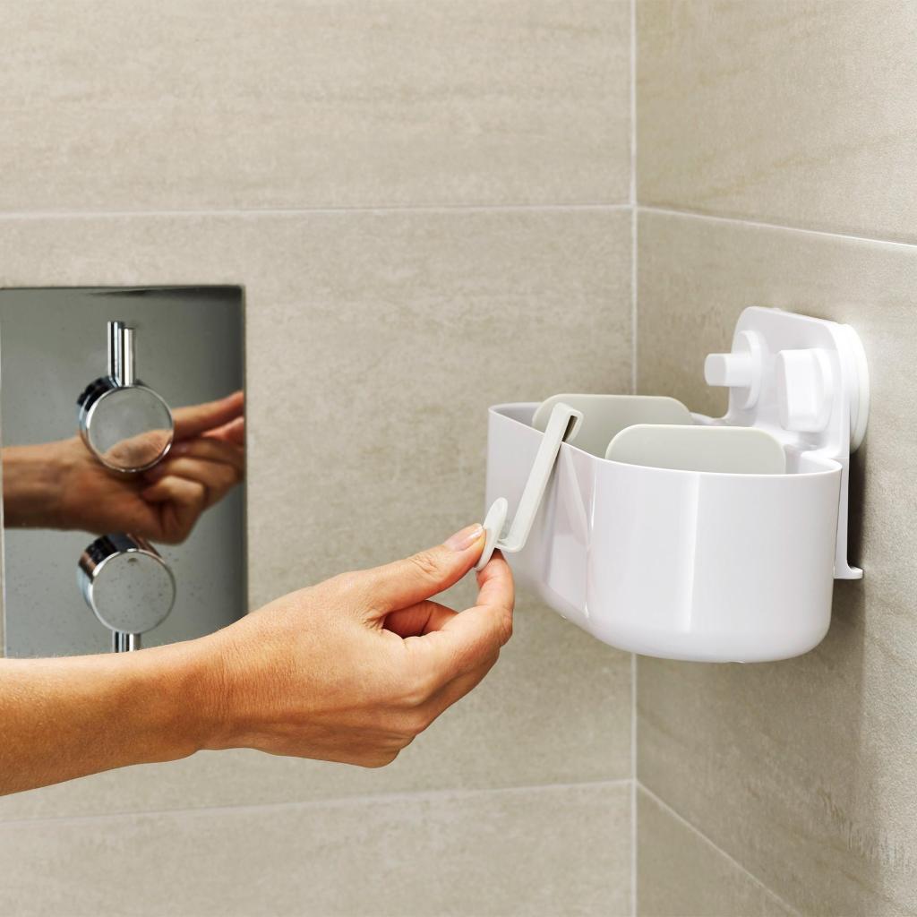 - Der Behälter ist aus strapazierfähigem Kunststoff gefertigt, der für die feuchte Umgebung im Badezimmer und in der Duschkabine geeignet ist.