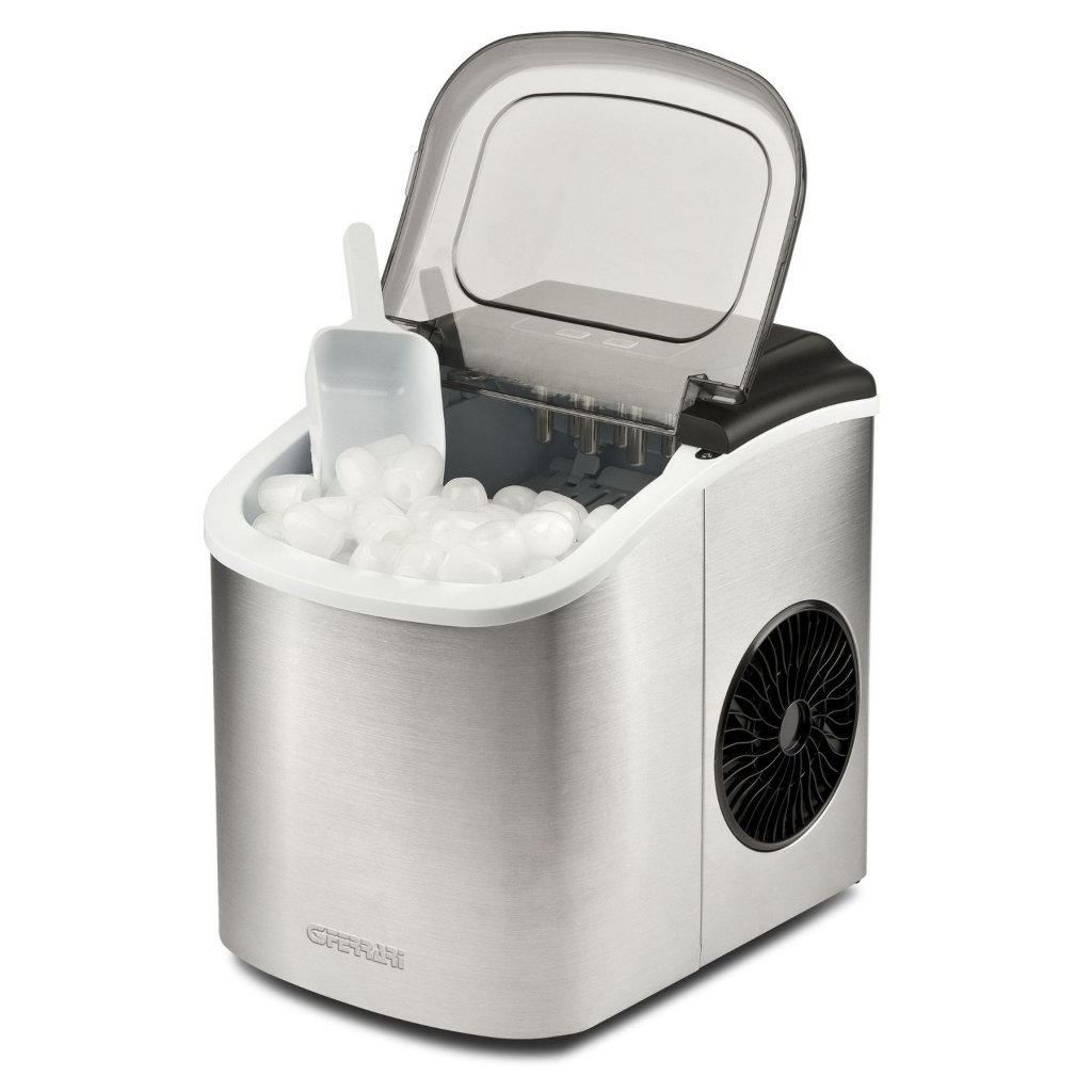 - der Wasserbehälter hat ein Fassungsvermögen von 1,2 Litern und die Eisschale fasst bis zu 600 Gramm Eiswürfel