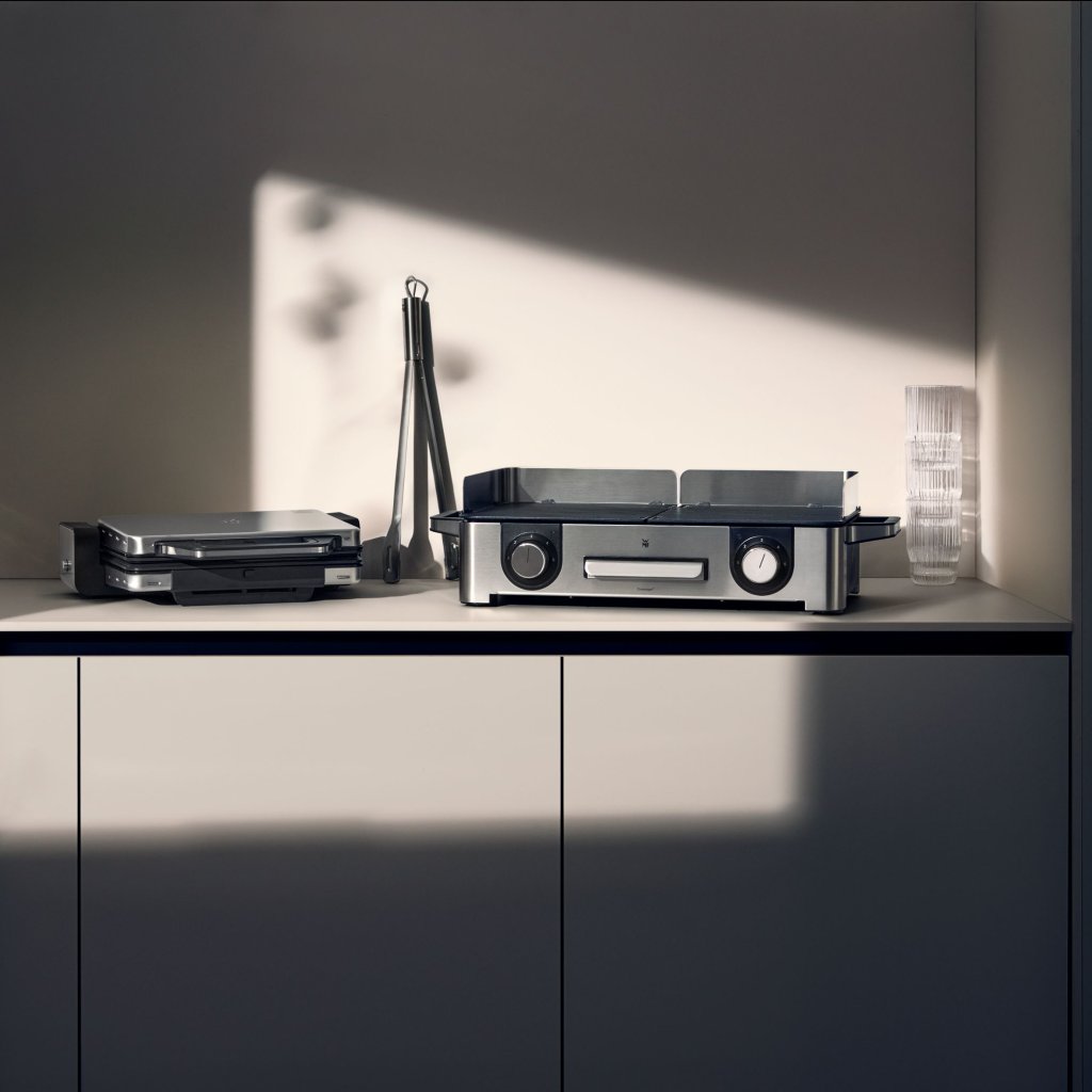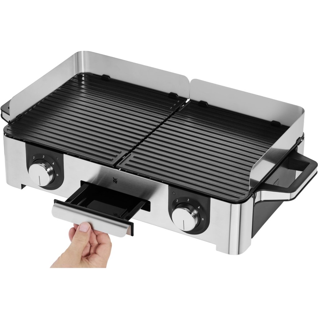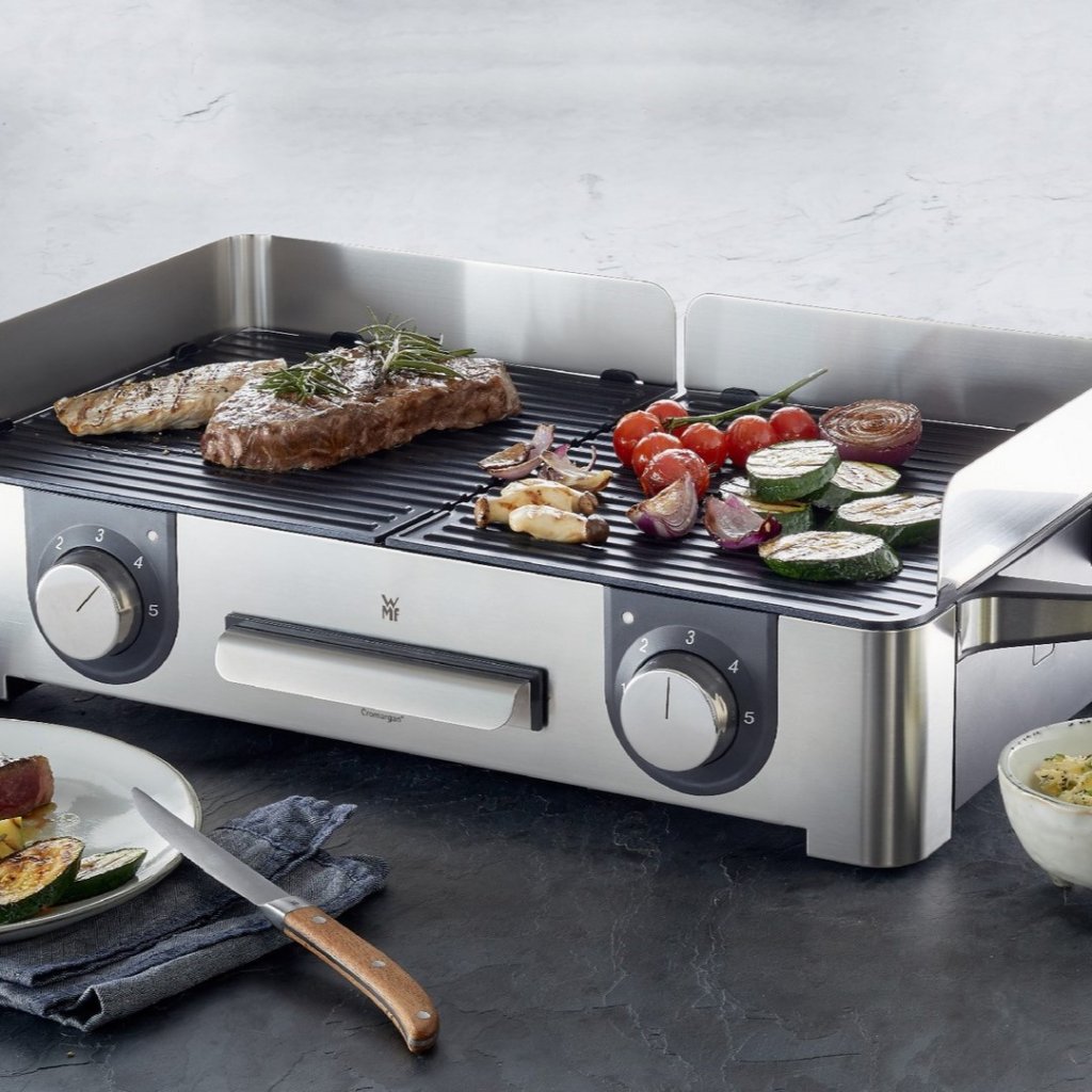 derMaster-Grill LONO der deutschen Marke WMF wurde in einem stilvollen Design aus gebürstetem Cromargan®-Edelstahl gefertigt. Er ist für das Grillen zu Hause oder im Garten gedacht. Die 28 x 50 cm2 große Grillfläche bietet ausreichend Platz für die Zubereitung vieler gegrillter Köstlichkeiten. Der Clou ist die Aufteilung seiner Oberfläche in zwei Platten, während jede eine andere Temperatureinstellung zum Grillen haben kann. Sie können 5 Temperaturstufenfür jede Scheibe wählen. So können Sie Fleisch und Gemüse gleichzeitig grillen, ohne sich Sorgen machen zu müssen, dass das Gemüse verbrennt. Dank seiner hohen Leistung von 2400 W garantiert der LONO master grill zudem perfekte Grillergebnisse.