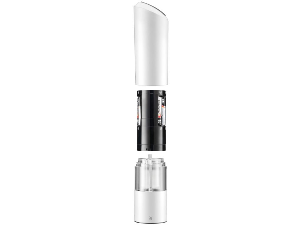 Die elektrische Gewürzmühle ist aus hochwertigem Kunststoff und langlebigem Acrylglas gefertigt. Das Keramikmahlwerk wird von WMF für zehn Jahregarantiert.