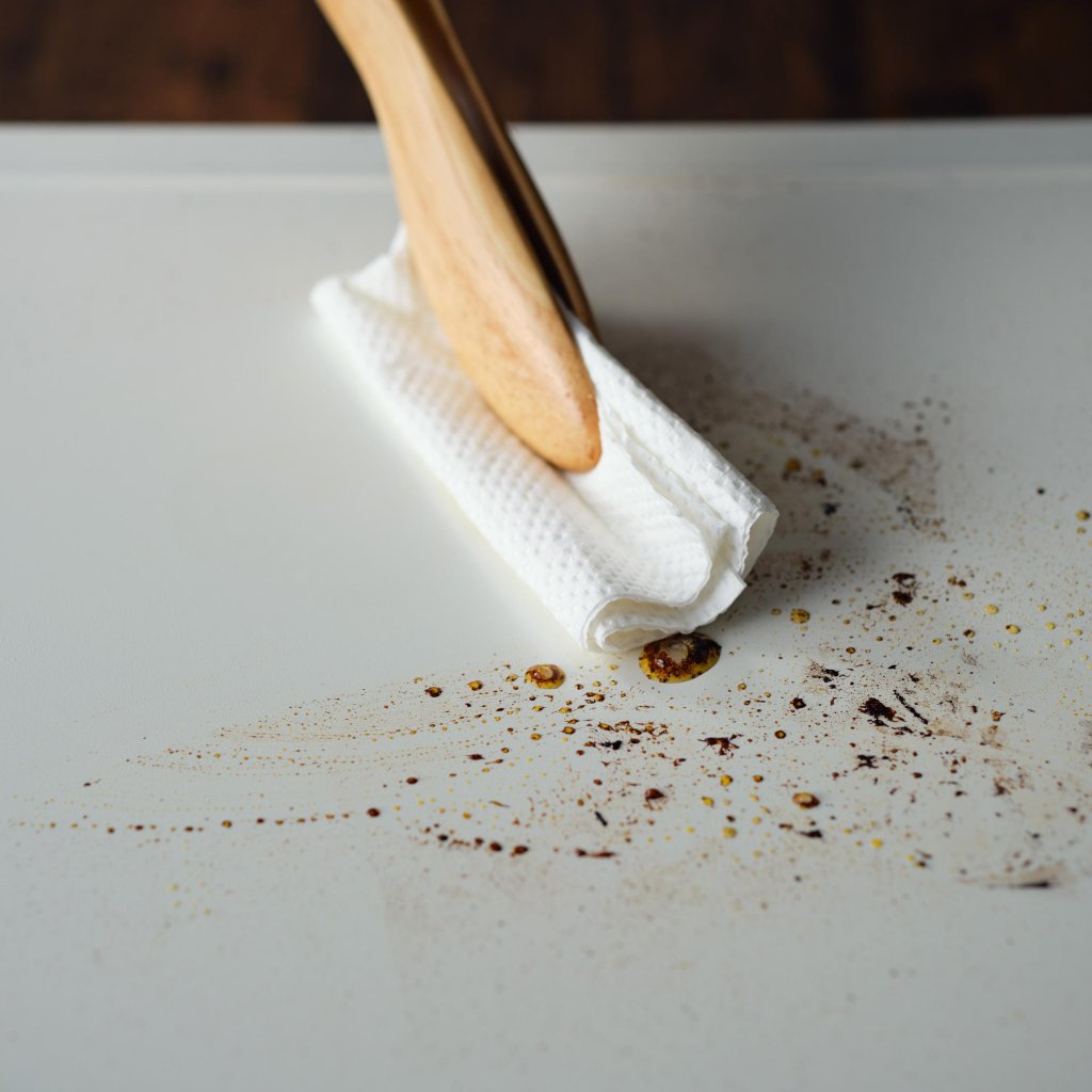 - Die Pflege des Grills ist denkbar einfach: Wischen Sie die Oberfläche nach dem Essen einfach mit einer Serviette ab, oder nehmen Sie die gesamte Platte und den Boden ab und waschen Sie sie unter fließendem Wasser.