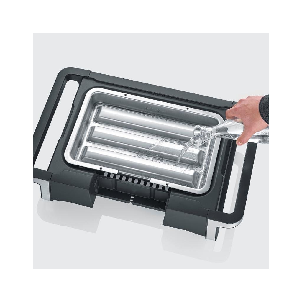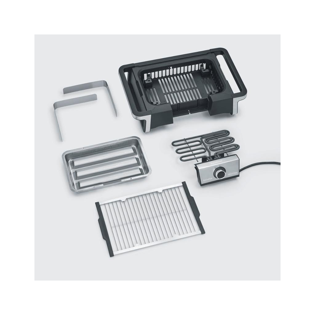 Es spielt keine Rolle, wie das Wetter draußen vor den Fenstern ist. Der Severin SENOA PG 8114 elektrische Tischgrill Severin ermöglicht die Zubereitung Ihrer Lieblingsgerichte, schnell und mit minimalem Aufwand. Die hohe Leistung von 3.000 W sorgt für beste Ergebnisse. Der Grillrost ist aus hochwertigem Edelstahl gefertigt und hat die Maße 41,5 × 24 cm, mit einer Gesamtfläche von 996 cm2 können Sie Speisen für die ganze Familie zubereiten. Der Grill hat eine isolierte SafeTouchOberfläche, um das Risiko von Verbrennungen zu vermeiden. Um den Grill herum befindet sich ein praktischer Windschutz , der auch in der Küche sehr geschätzt wird, da er Spritzer auf der Küchenarbeitsplatte wirksam verhindert. Das lange Netzkabel von 2 Metern gibt Ihnen die Flexibilität, die Sie brauchen.