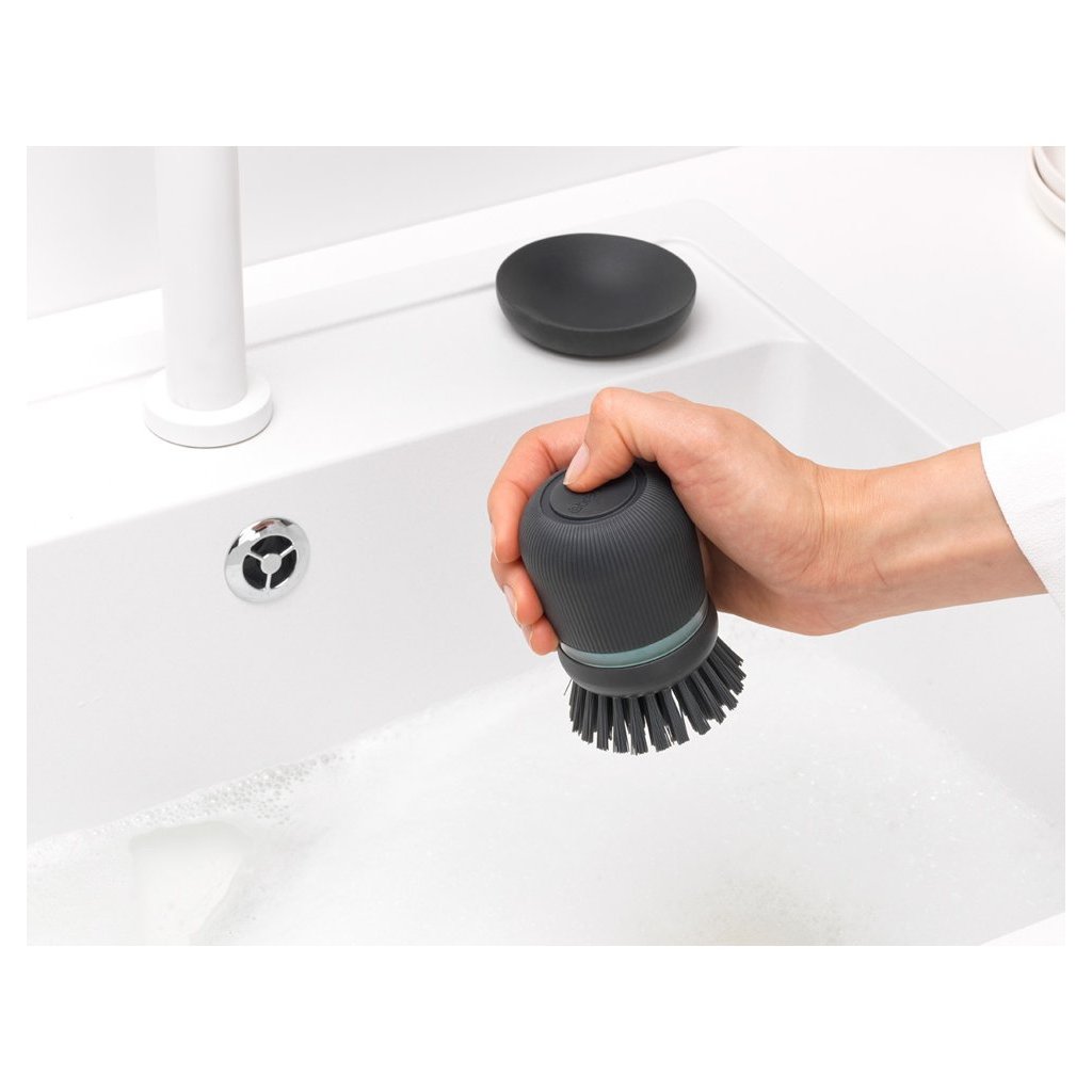 Dieses clevere Gerät macht den Abwasch ganz einfach! Drücken Sie den Knopf, um die richtige Menge an Reinigungsmittel zu dosieren. Die strapazierfähigen Nylonborsten sind hart genug zum Schrubben, aber auch weich genug, dass sie nicht kratzen. Immer zur Hand in einer sauberen Schale.