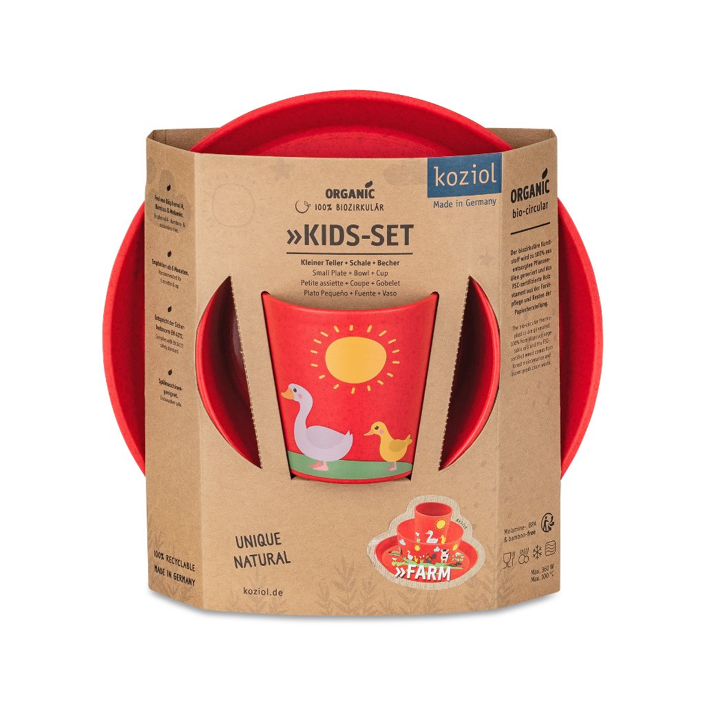 Das Kindergeschirr FARMA (mit einem BAUERNHOF) von Koziol enthält eine Tasse, eine Schüssel und einen Teller in roten Farben und mit Abbildungen von Tieren, die man auf dem Bauernhof antreffen kann. Eine Kuh, ein Schwein, ein Pferd oder eine Ente - sie alle leisten Ihrem Kind bei seinen ersten Essversuchen Gesellschaft.