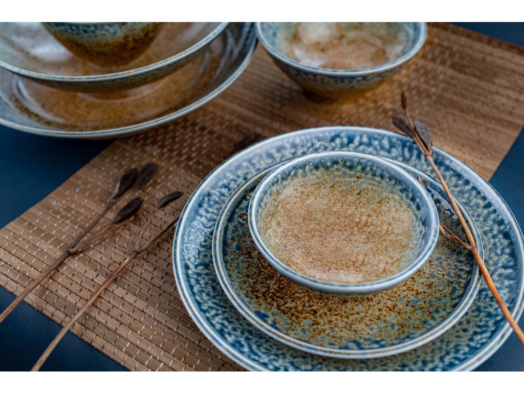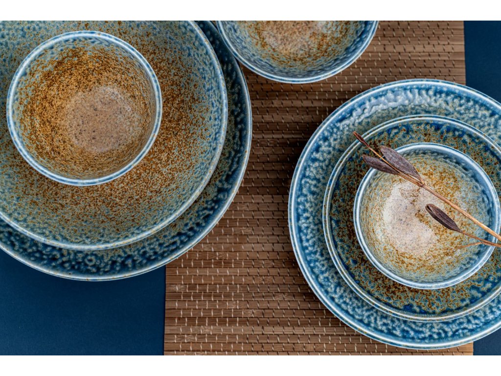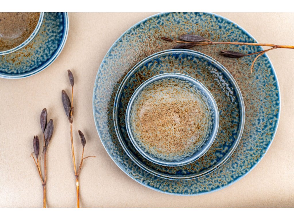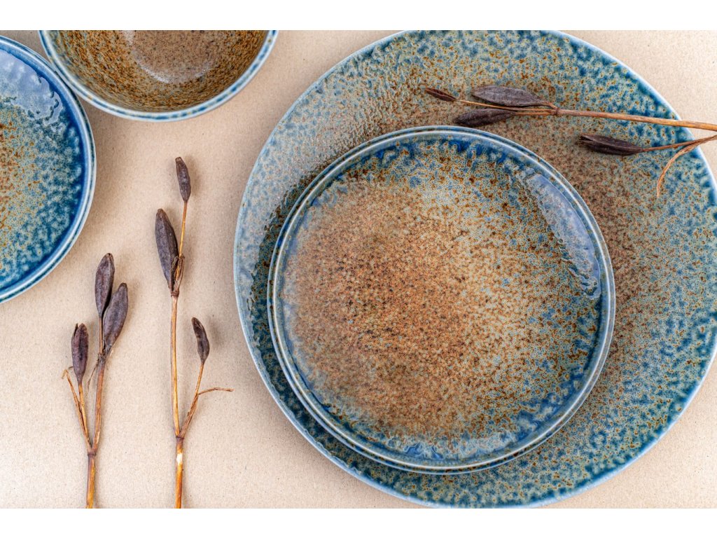 Die Kollektion Earth & Sky ist von den Farben der Erde und des Himmels inspiriert. Die Mitte des Tellers hat eine hellbraune Farbe, die an die Farben der Erde erinnert. Die blaue Farbe der Umrandung stellt den Himmel dar. Das Geschirr hat eine feinkörnige Oberfläche.