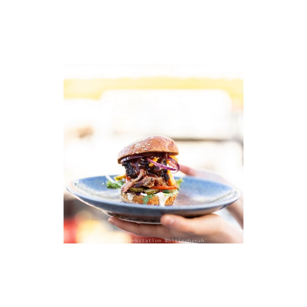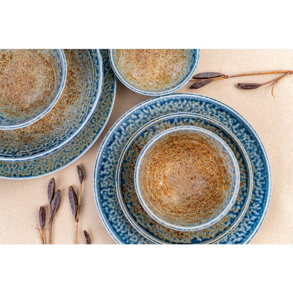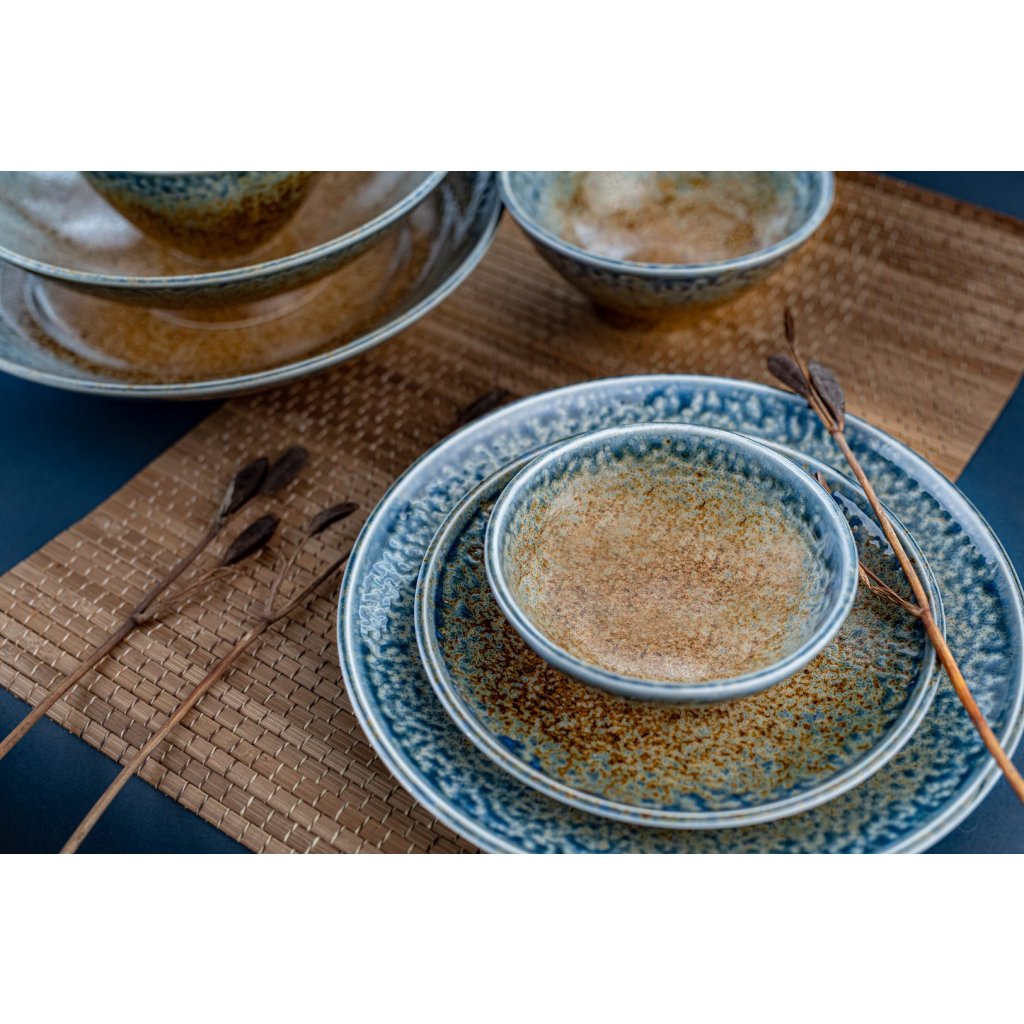 Die Kollektion Earth & Sky ist von den Farben der Erde und des Himmels inspiriert. Die Mitte des Tellers hat eine hellbraune Farbe, die an die Farben der Erde erinnert. Die blaue Farbe der Umrandung stellt den Himmel dar. Das Geschirr hat eine feinkörnige Oberfläche.