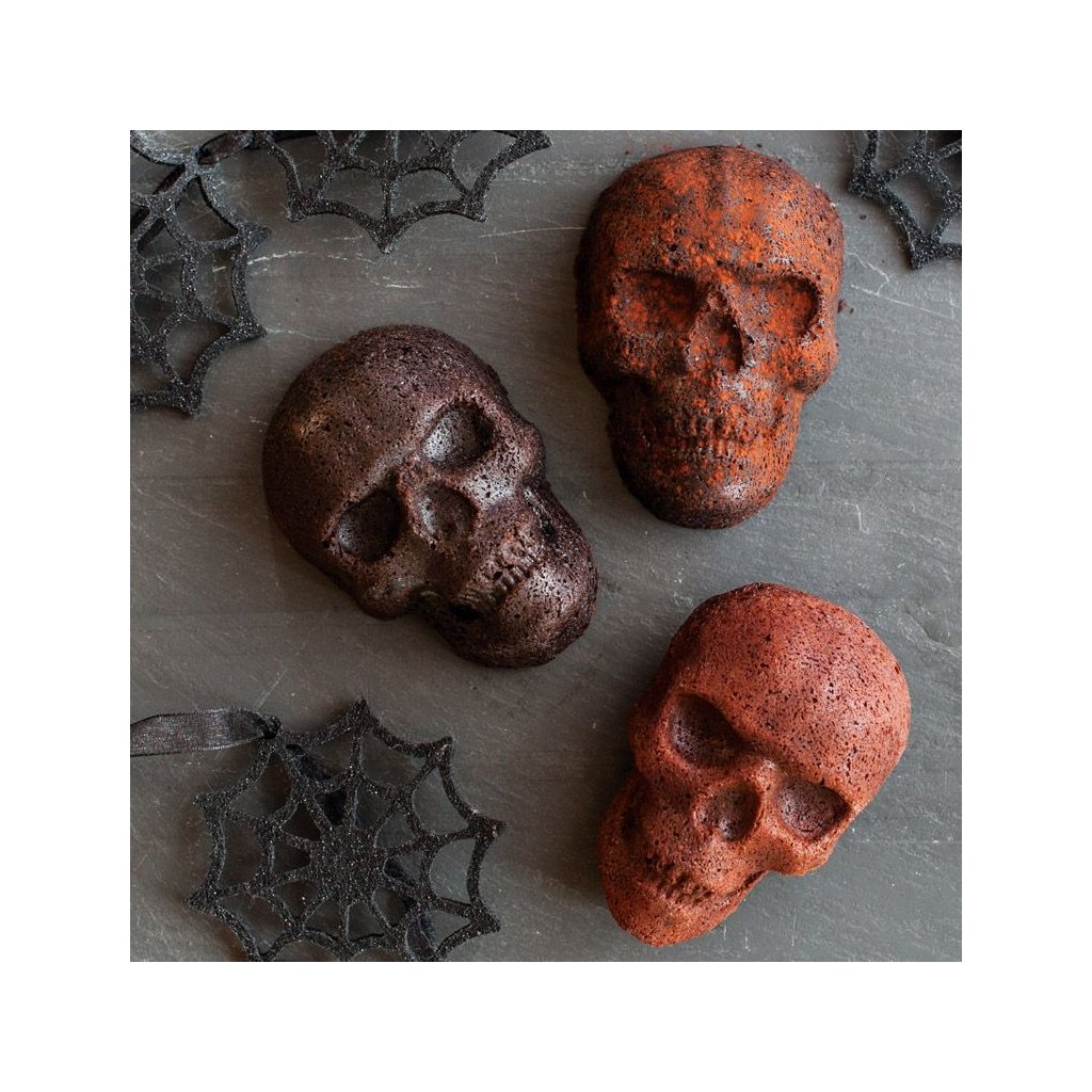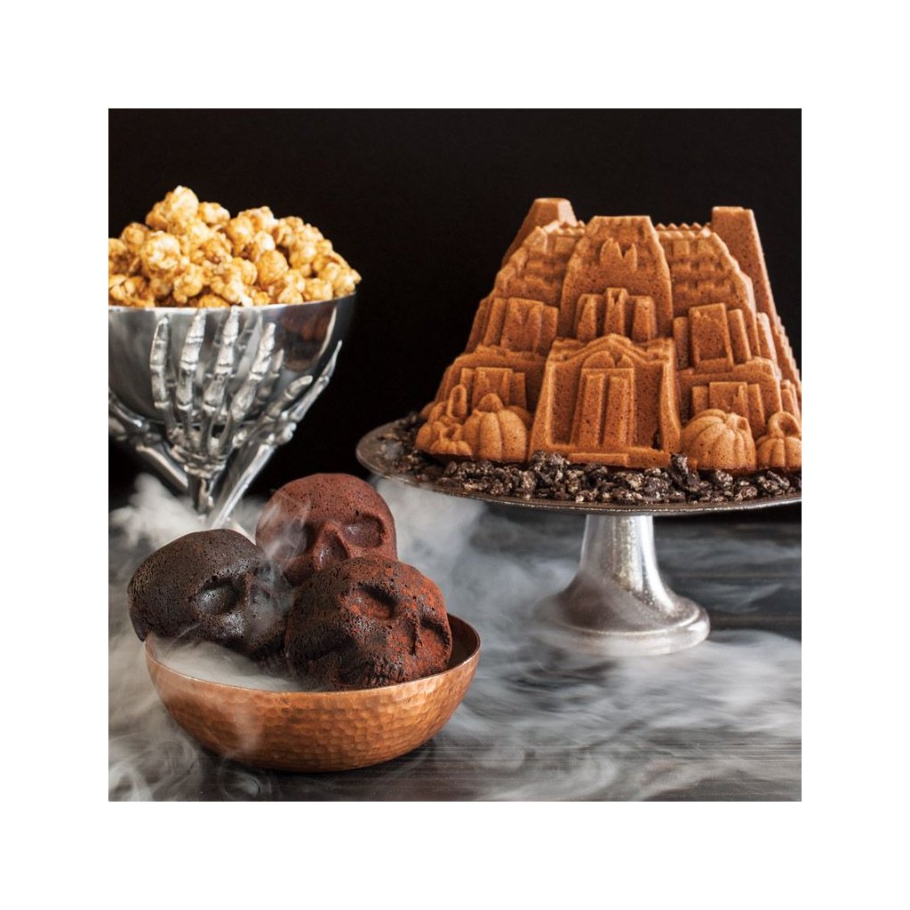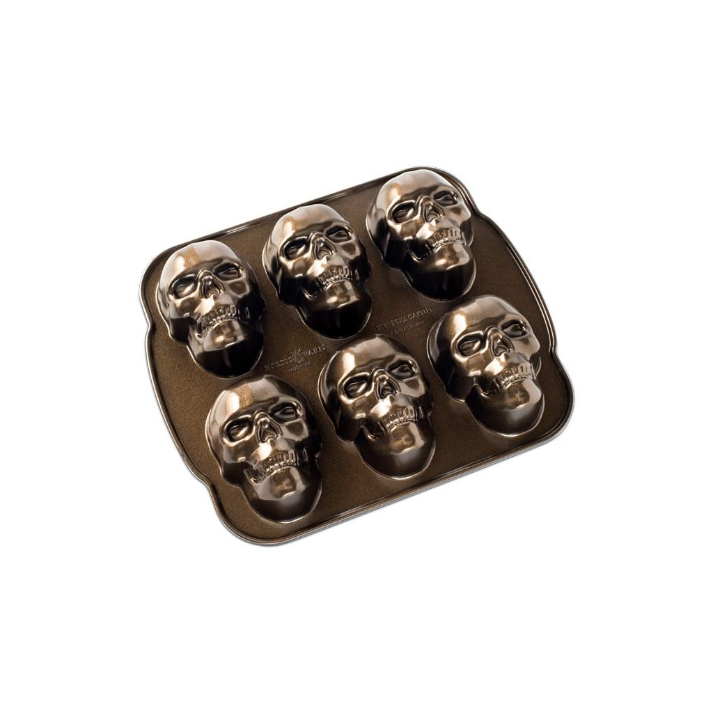 Die Bronzeform für 6 Haunted Skull Bundt® Keksschädel aus der herbstlichen Kollektion Fall Harvest der amerikanischen Marke Nordic Ware ist aus hochwertigem, massivem Aluminiumguss mit Antihaftbeschichtung gefertigt. In den Formen für sechs identische Schädel mit aufwendigen Details können Sie Ihren Lieblingsmuffinteig backen oder sechs Skelettköpfe direkt aus Schokolade gießen.