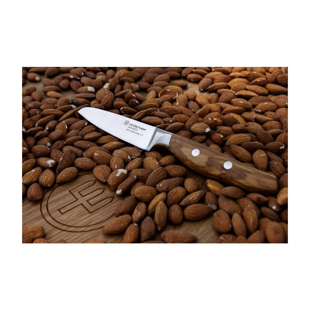 Wüsthof Amici Gemüsemesser mit einer Klinge aus hochwertigem rostfreiem Stahl und einem einzigartigen Muster auf dem Holzgriff, das jedes einzelne Amici-Messer zum Original macht. Hergestellt in Deutschland.