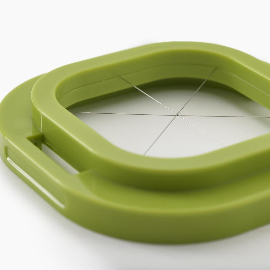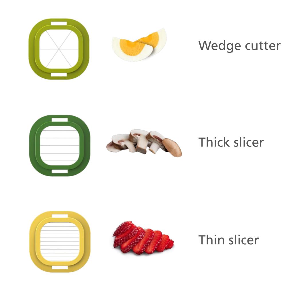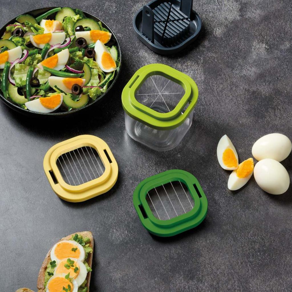 - Der Aufsatz zum Keile schneiden teilt Lebensmittel in regelmäßige Portionen, was ideal für gekochte Eier oder weiches Obst ist.