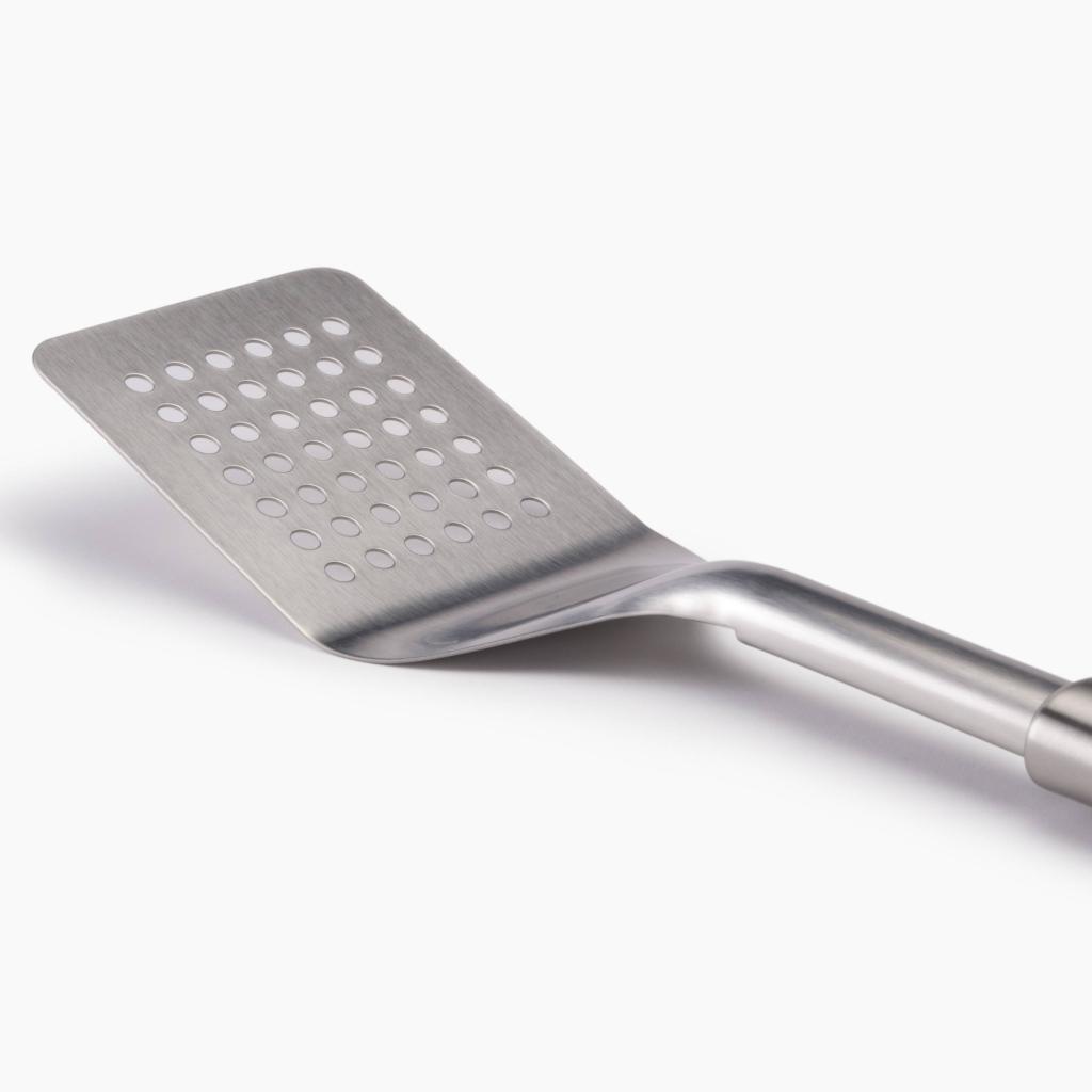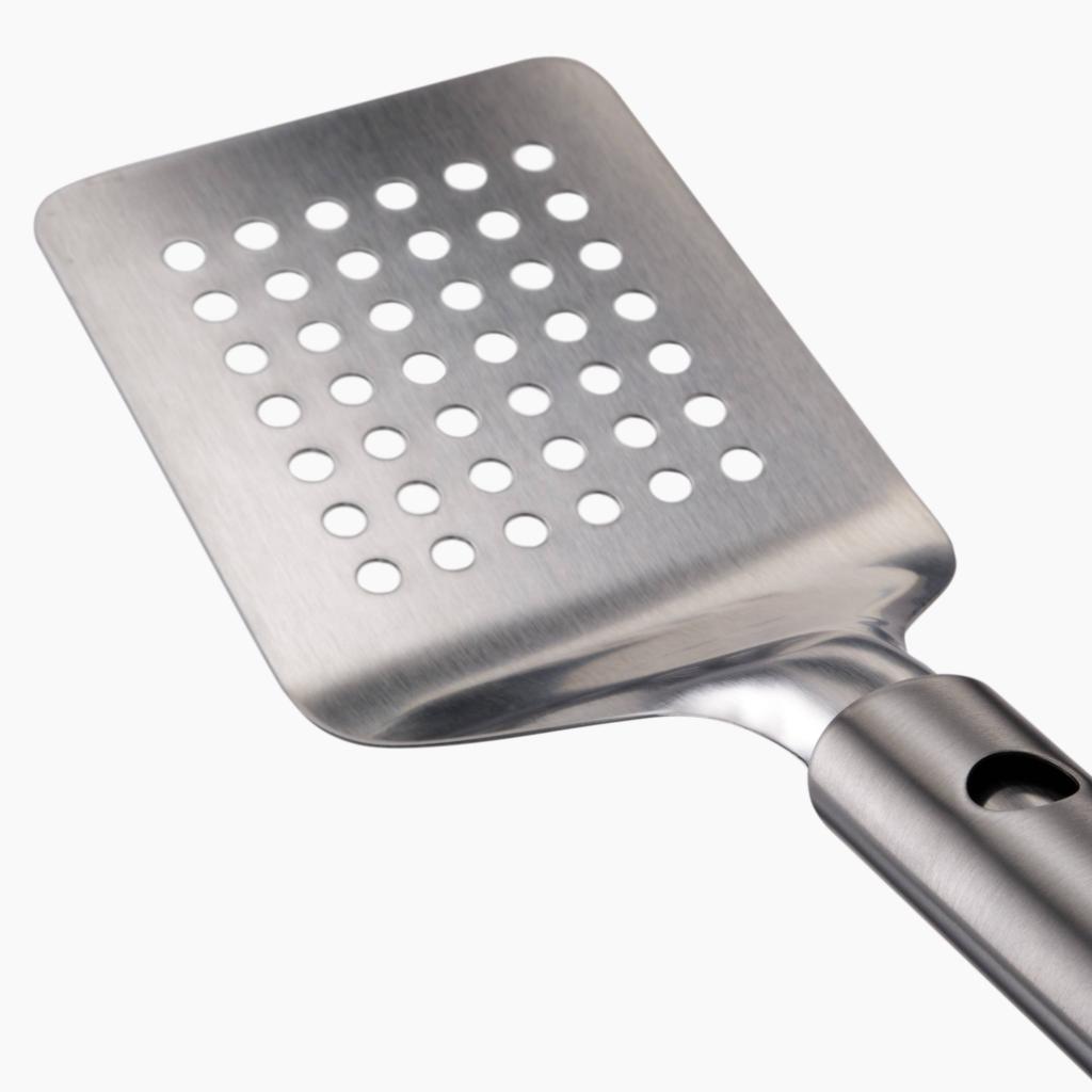- Die breite, gelochte Oberfläche ermöglicht das bequeme Aufnehmen größerer Lebensmittelstücke und sorgt für Stabilität bei der Handhabung auf dem heißen Grill.