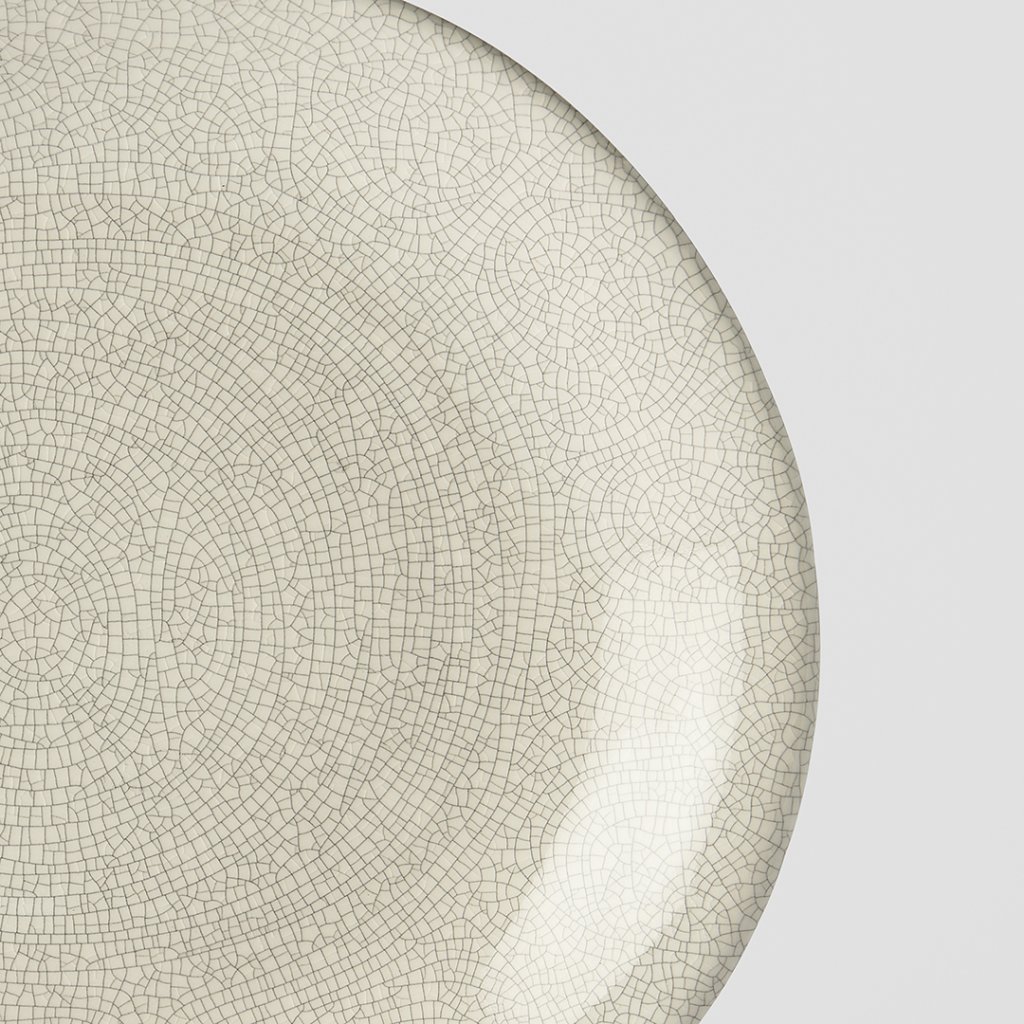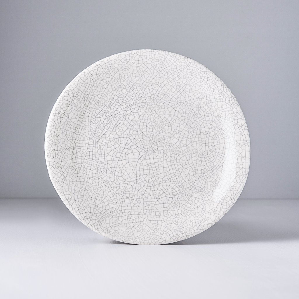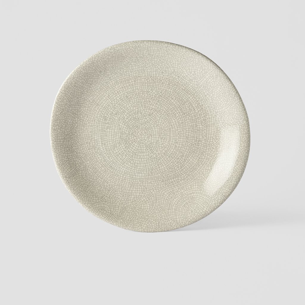 Großer flacher Teller in weiß-grau mit einem besonderen Effekt, der wie eine Craquelé-Glasur aussieht. Der Teller hat eine unregelmäßige Form und sein Design ist einzigartig.
