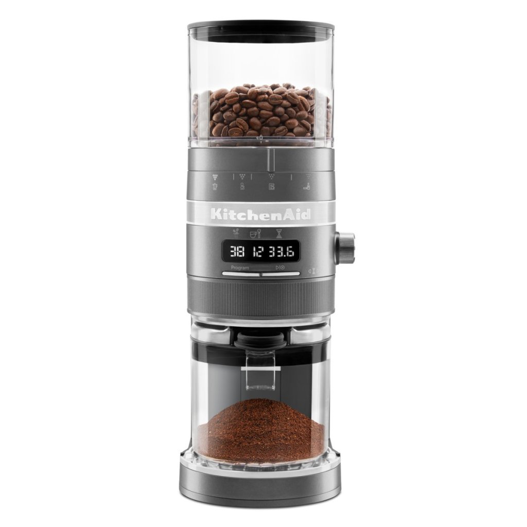 Gönnen Sie sich jeden Tag einen köstlichen Kaffee! Die silberne Artisan-Kaffeemühle 5KCG8433 mit intuitiven Bedienelementen und Edelstahlmahlsteinen bietet bis zu 70 einzigartige Mahlgradeinstellungen, von der feinsten für Espresso bis zur gröbsten für Cold Brew, aber keine Sorge, alles ist leicht einzustellen. Er ist außerdem mit einer intelligenten Dosierungstechnologie ausgestattet, die die Mahldauer und den Mahlgrad für die gewählte Zubereitungsmethode (z. B. French Press, Expresso oder Tropfkaffee) auswählen kann.