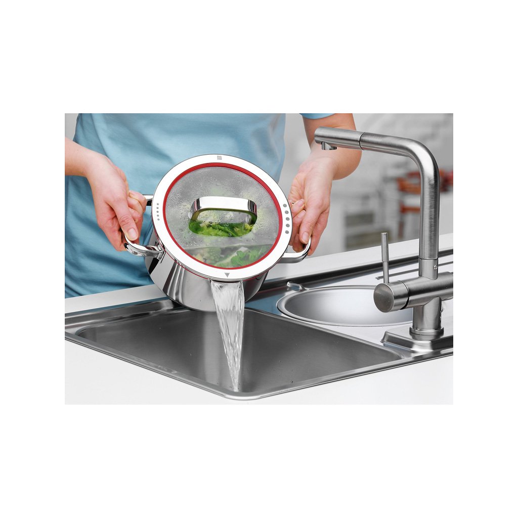 Das Kochgeschirr mit Funktion 4 hat außerdem einen breiten, gewölbten Rand, der das Ausgießen des Inhalts erleichtert. Dadurch wird verhindert, dass Flüssigkeit an den Außenwänden des Topfes heruntertropft oder -läuft. Die interne Messskala macht es einfach, die optimale Flüssigkeitsmenge zu messen. Töpfe sind leicht zu reinigen, sie können natürlich in der Spülmaschine gewaschen werden.