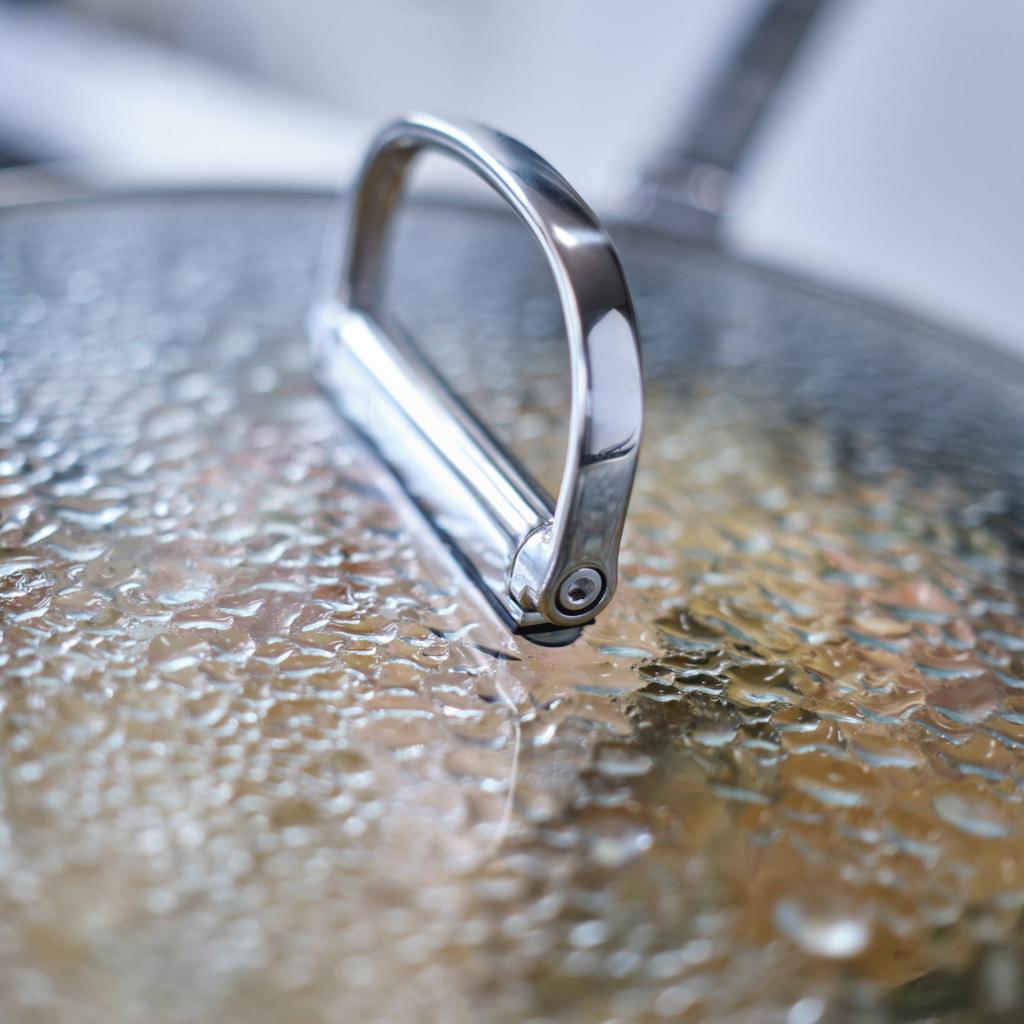 - Es umfasst ein Topfdeckel gehärtetes Glas mit einem Edelstahlrand und einen klappbaren Edelstahlgriff für eine noch sparsamere Aufbewahrung.