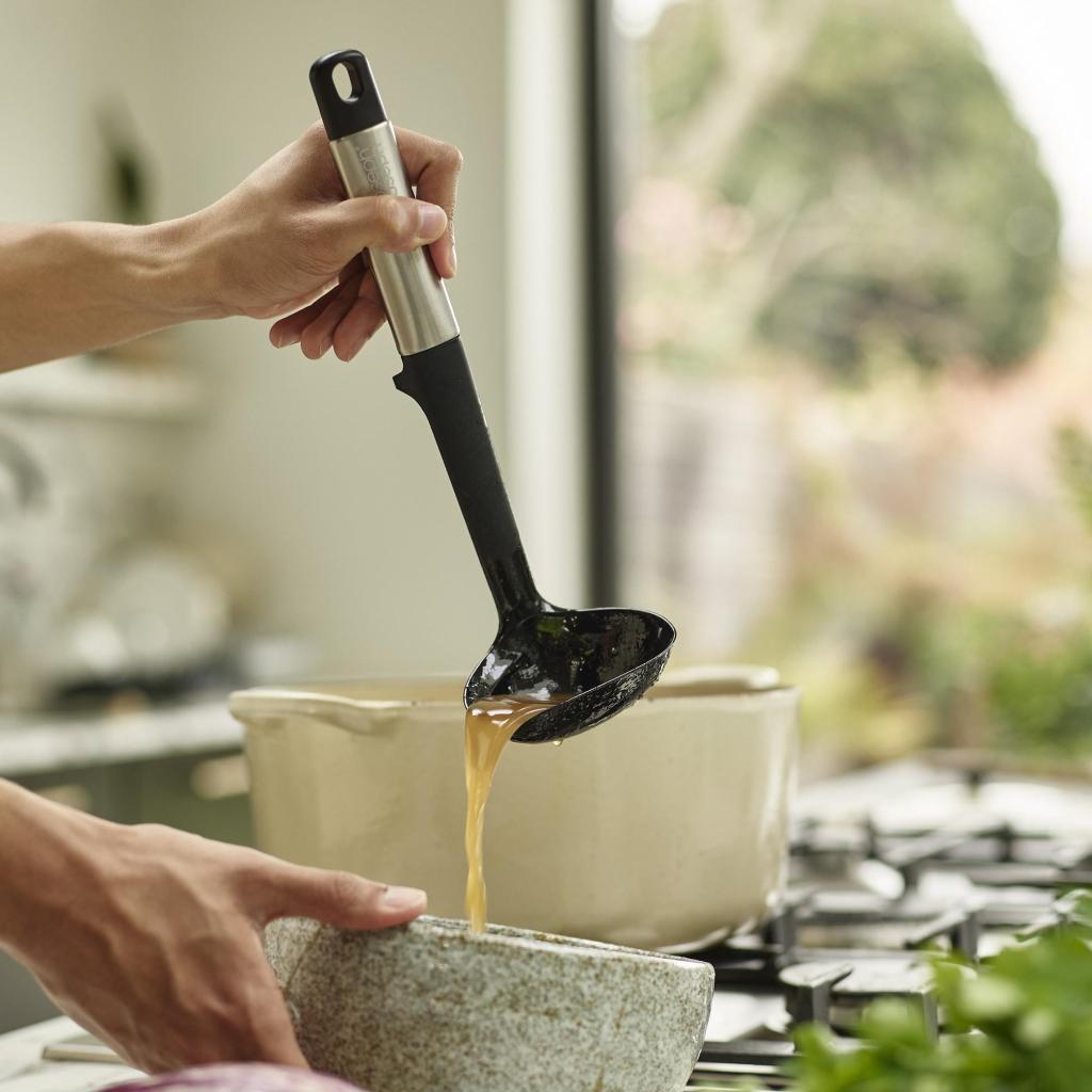 - Kelle Joseph Joseph ELEVATE ist ein praktischer Küchenutensilien , der zum bequemen Schöpfen, Servieren und Ausgießen von Suppen, Saucen oder Eintöpfen direkt aus Töpfen und Pfannen entwickelt wurde.