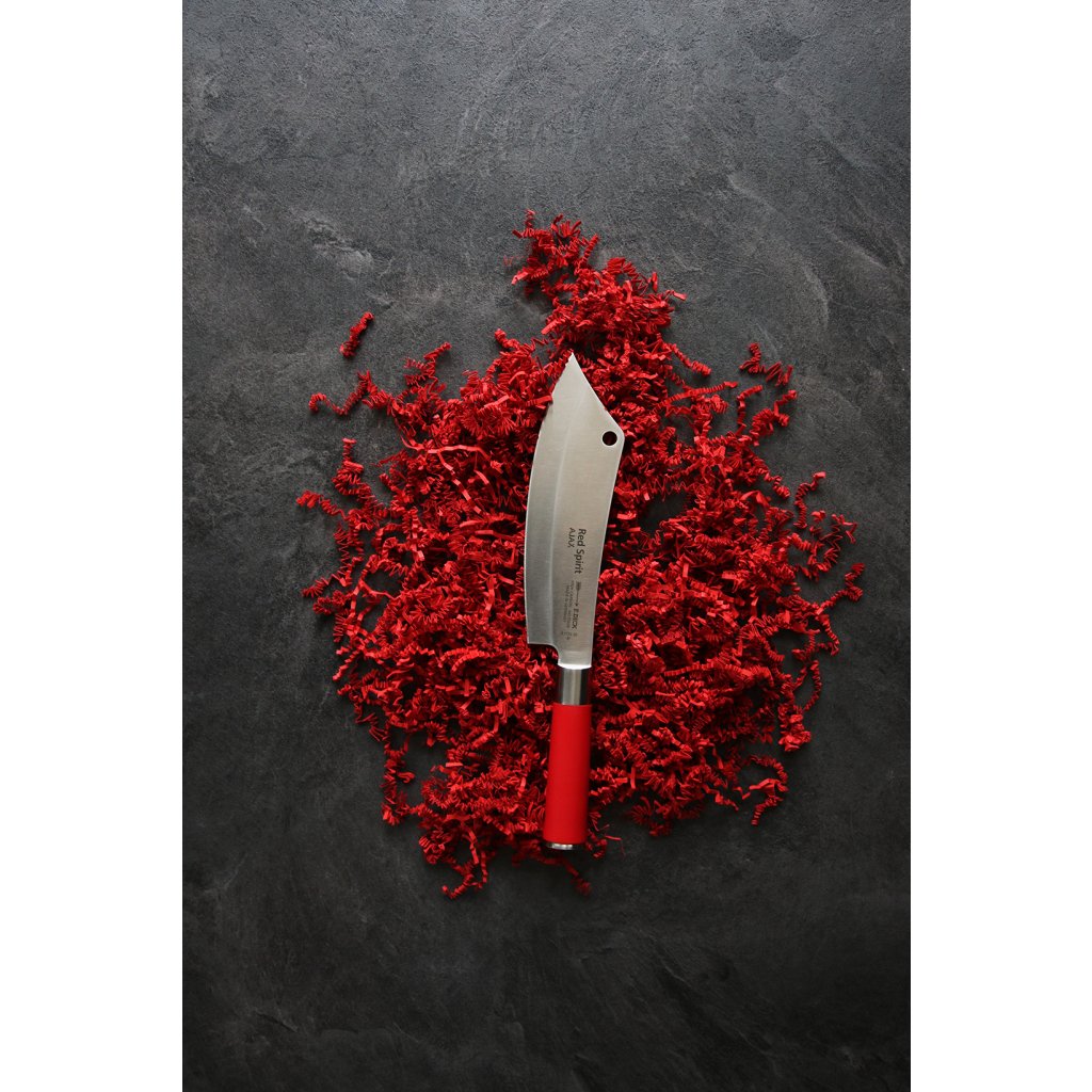 Das AJAX Kochmesser bietet einen markanten Klingenstil in einer Länge von 20 cm mit einer breiten Fläche und einer markanten Kurve der Klinge. Die ungewöhnliche Form erinnert an ein Hackbeil und ist der ideale Helfer bei der Fleischverarbeitung. Dank des praktischen Lochs in der Klinge kann das Messer einfach aufgehängt werden. Schon auf den ersten Blick spürt man die Inspiration, Leidenschaft und Begeisterung der Red Spirit Messerserie. Messer aus dieser Serie sind extrem scharf. Die Klingen sind sehr dünn geschliffen und poliert. Der für asiatische Messer typische runde Griff liegt perfekt in der Hand und verursacht keine Druckstellen.