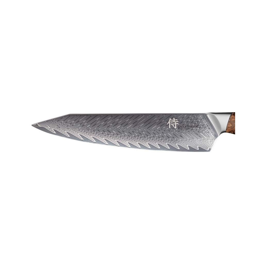 - schimmerndes Damaszener-Muster auf der Klinge (erinnert an ein stürmisches Meer) minimiert die Reibung beim Schneiden und verhindert, dass Lebensmittel an der Klinge kleben bleiben