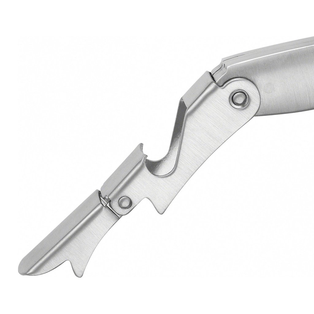 - Integrierter Kronkorkenöffner, Korkenzieher und Messer