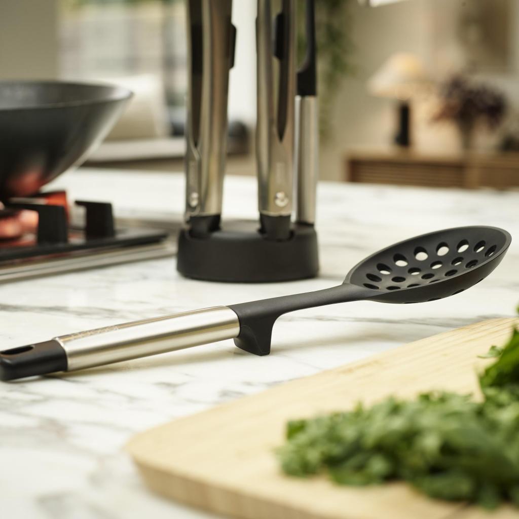 - Griffe aus Edelstahl verleihen den Utensilien Festigkeit, Haltbarkeit und ein modernes Aussehen, das für heutige Küchen geeignet ist.