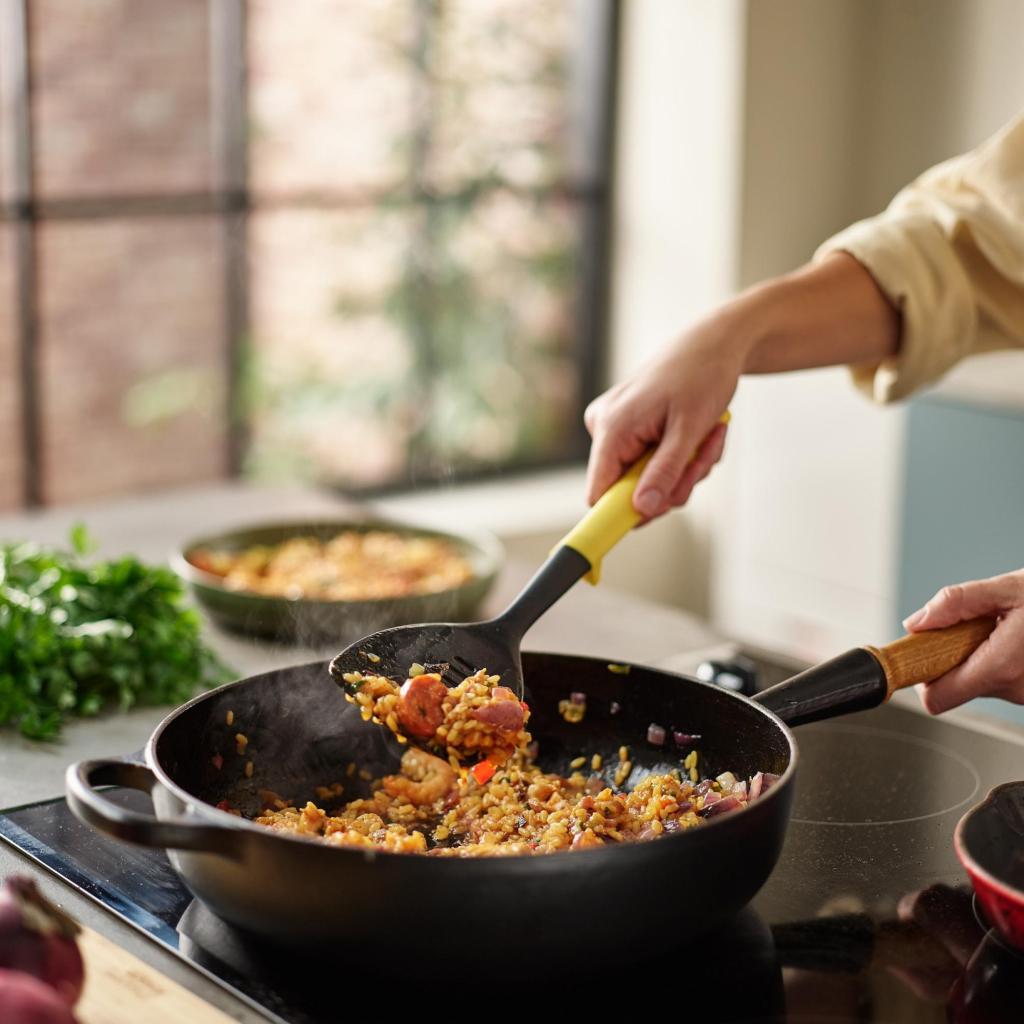 - Der ergonomisch geformte Griff bietet einen sicheren und bequemen Halt, auch bei längerer Handhabung über der heißen Pfanne.