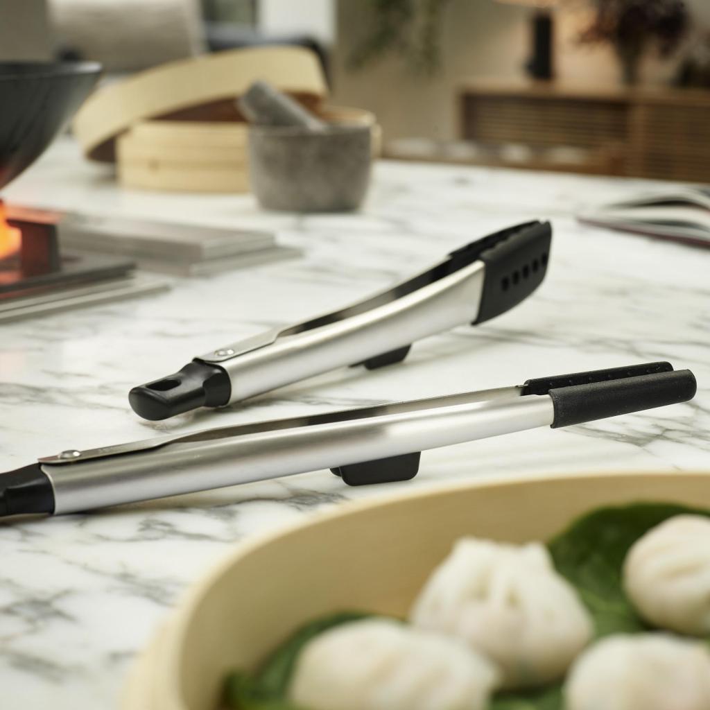 - Integrierte Stützen sorgen dafür, dass sich der Greifteil der Zange während des Kochens oder Servierens nicht auf der Arbeitsfläche ablegt.