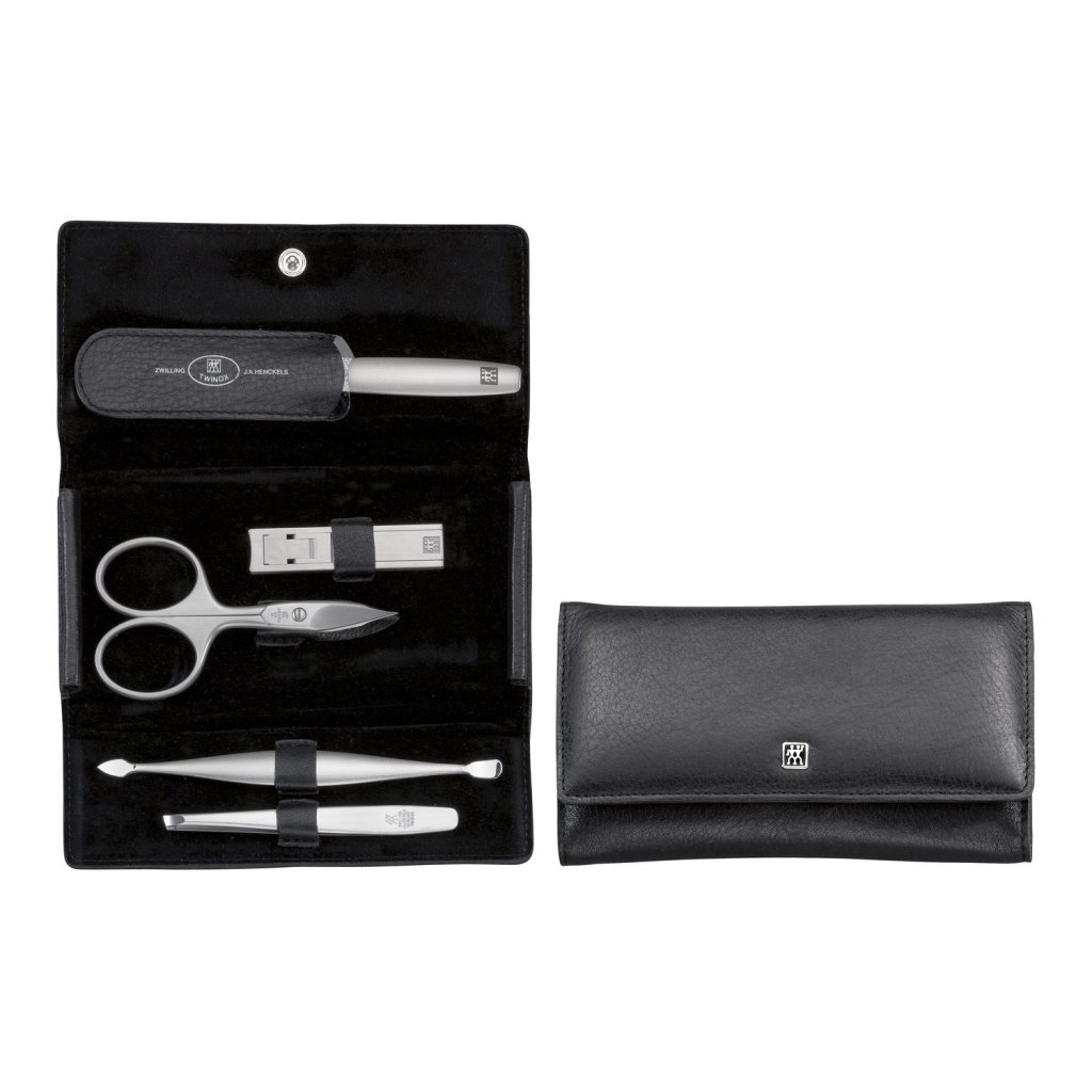 Das TWINOX®Asian Competence Maniküretui mit Schnappverschluss ist aus schwarzem Nappaleder gefertigt. Das elegante und schlichte Design des Etuis in Kombination mit den hochwertigen Manikürwerkzeugen macht es zu einem praktischen und schönen Geschenk.