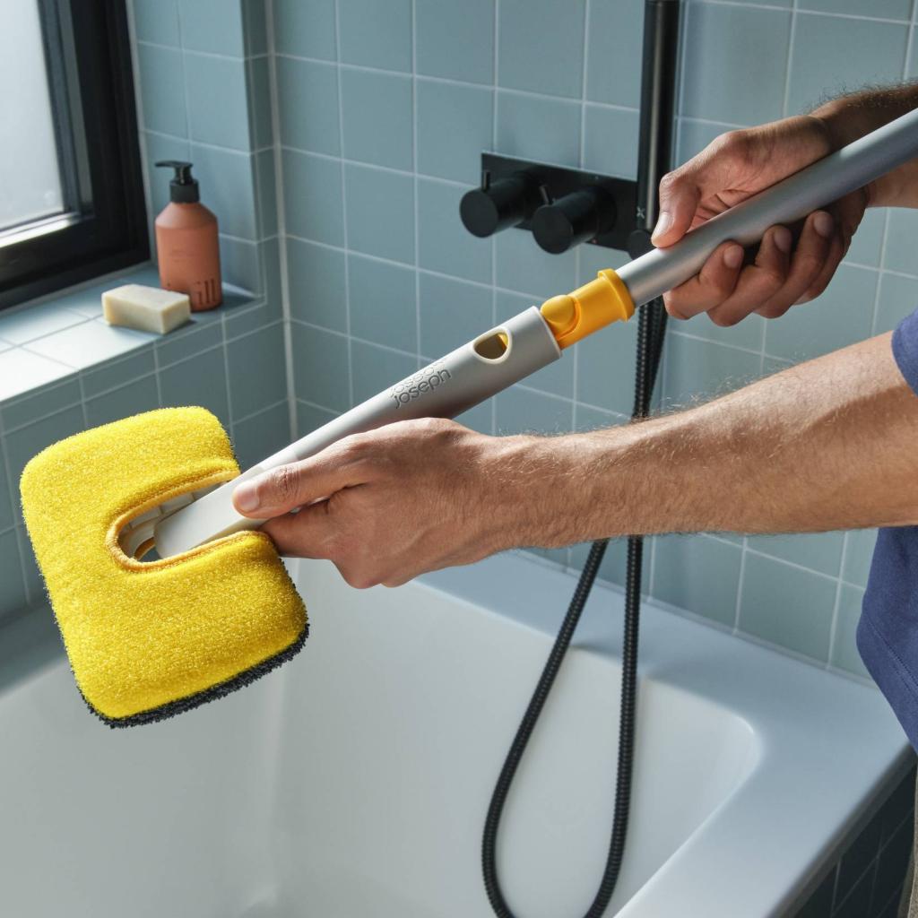 - Die Möglichkeit, eine Verlängerungsstange anzuschließen, erleichtert die Pflege von Duschabtrennungen, höheren Fliesen oder der Rückseite von Badewannen, ohne sich zu bücken.