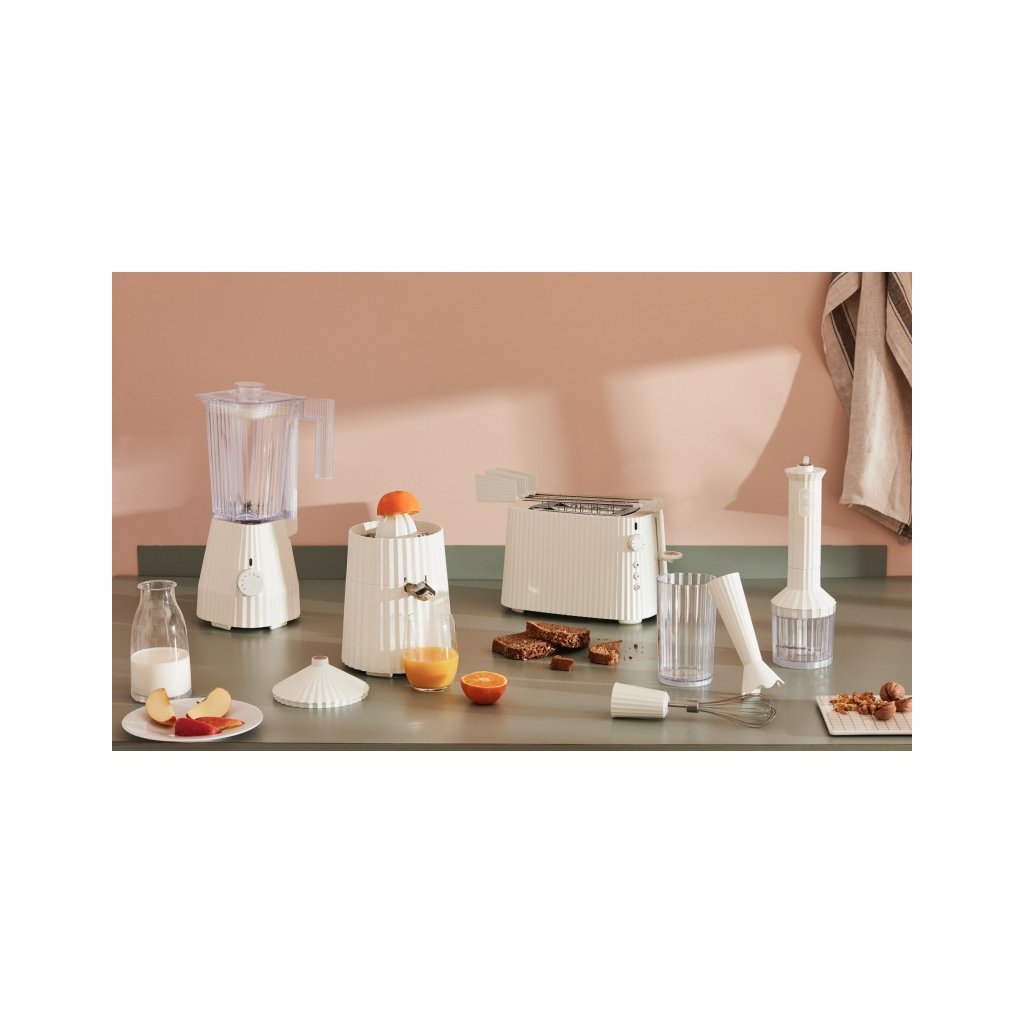Der stilvolle Toaster Plissé von den italienischen Meistern des angewandten Designs der Marke Alessi. Die fantasievolle Oberflächenbehandlung Plissé, die an einen Faltenrock erinnert, verleiht den Geräten einen unerwartet frischen Look. Die Schlitzen und das gesamte Innere des Toasters sind aus hochwertigem Edelstahl gefertigt. Die äußere Oberfläche ist aus hochwertigem thermoplastischem Harz gefertigt. Die Bedienelemente und Griffe des Brötchenaufsatzes, der nicht im Liferumfang enthalten, sondern separat erhältlich ist, sind aus demselben Material gefertigt, um einen besseren Griff zu ermöglichen.