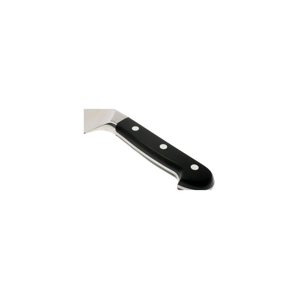 Der ergonomische Griff ist aus strapazierfähigem Kunststoff gefertigt, der bruchsicher, stoßfest oder resistent gegen Lebensmittelsäuren ist. Es ist spülmaschinenfest. Die Schäfte sind mit drei Nieten am Schaft befestigt. Die perfekte Verklebung der Einzelteile verhindert das Festsetzen von Ablagerungen und Bakterien, so dass die Messer strenge Hygienestandardserfüllen.