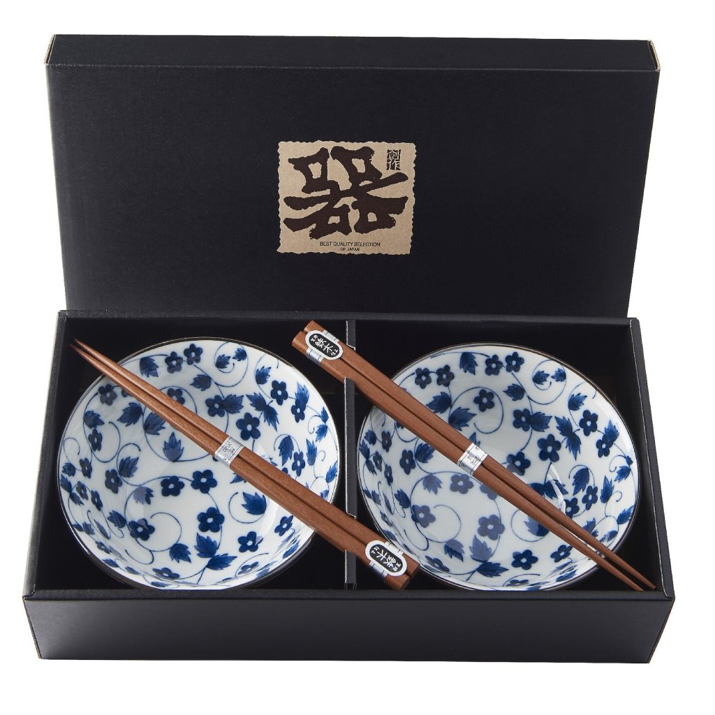 Das Set enthält 2 Paar Essstäbchen aus Holz und 2 Schalen in Weiß mit handgemalten blauen Blumen. Das Set wird in einer eleganten schwarzen Geschenkbox geliefert und eignet sich daher auch als Geschenk für Freunde oder Geschäftspartner.