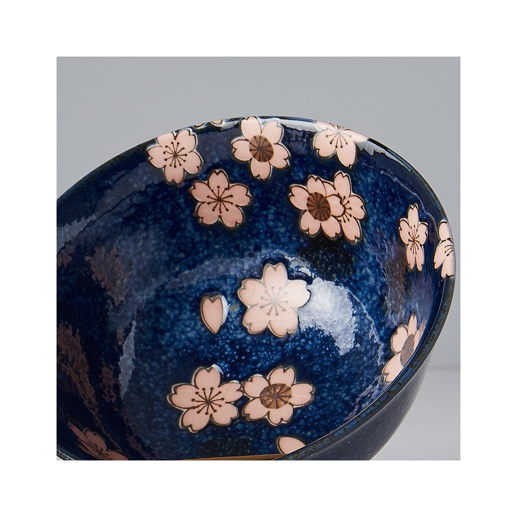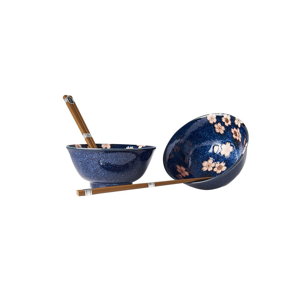 Das Set enthält zwei Paar Essstäbchen aus Holz und zwei dunkleblaue Schüsseln mit handgemalten lachsfarbenen Blumen. Das Set wird in einer eleganten schwarzen Geschenkbox geliefert und eignet sich daher auch als Geschenk für Freunde oder Geschäftspartner.