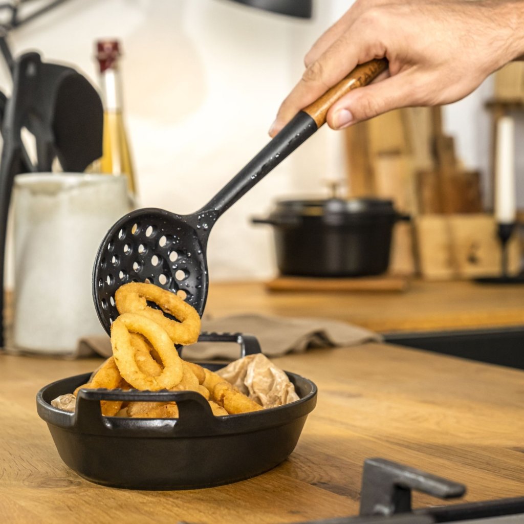 - der Arbeitsteil aus schwarzem, mattem Silikon ist perfekt mit gusseisernem Kochgeschirr kompatibel Staub