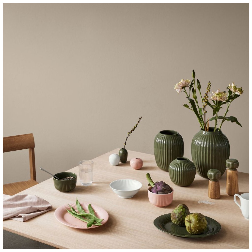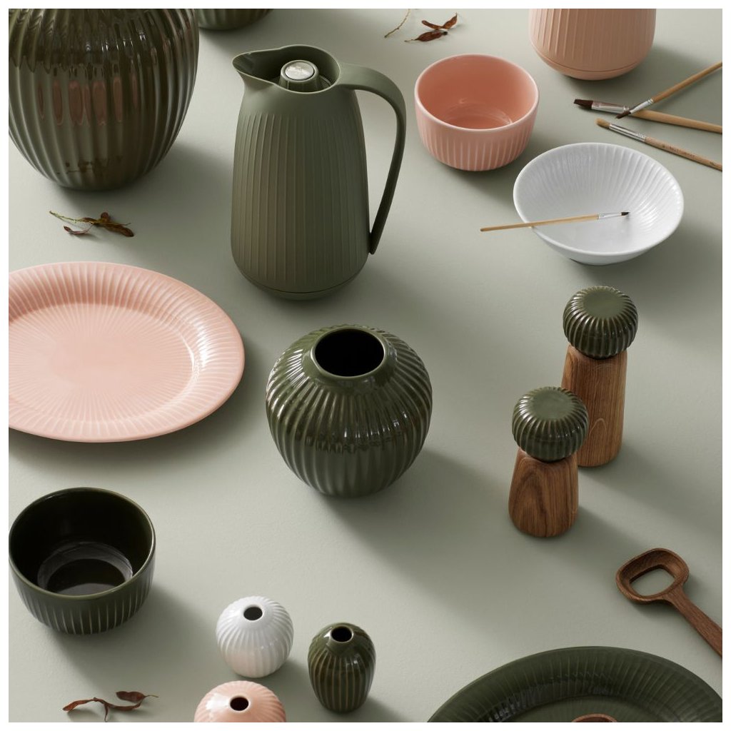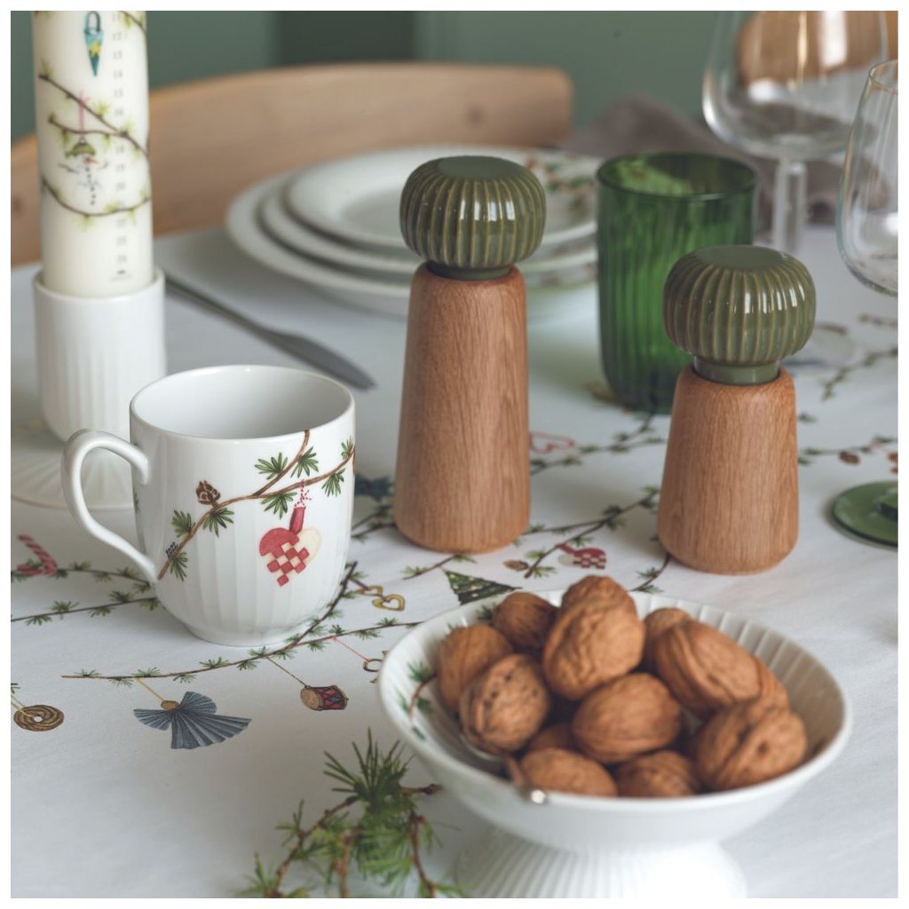 Diese 14,5 cm große Salz-/ Pfeffermühle ist aus massivem, geöltem Eichenholz gefertigt und verfügt über einen dunkelgrünen Porzellanknauf, der für einen festen Griff sorgt und die Bedienung der Mühle vereinfacht. Das Design des abgerundeten Knopfes zeichnet sich durch die legendären Rillen aus, die für die Kollektion Hammershøi von Kähle, die aus praktischen Küchenaccessoires und schönem Geschirr besteht, charakteristisch sind.