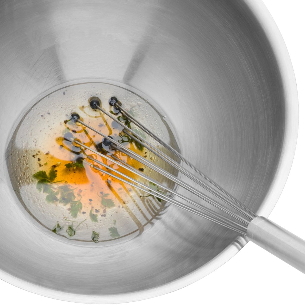 Der innovative Profi Plus Schneebesen ist der Star unter den Schneebesen. Dank der vielen oszillierenden Kugeln bringt es viel Luft in die gemischte Masse ein, garantiert ohne "Klumpen". Dank der Eigenschwingungen der Kugeln auf den Drähten wird die Suppe blitzschnell umgerührt und die Sahne in Sekundenschnelle abgewischt. Die Drähte reichen bis zum unteren Rand des Topfes oder der Schüssel und dank der großen Reichweite bleibt nichts am Boden liegen. Zwischen den Drähten bleibt nichts "hängen", so dass der Besen leicht und schnell zu reinigen ist und die Hygiene gewährleistet ist.