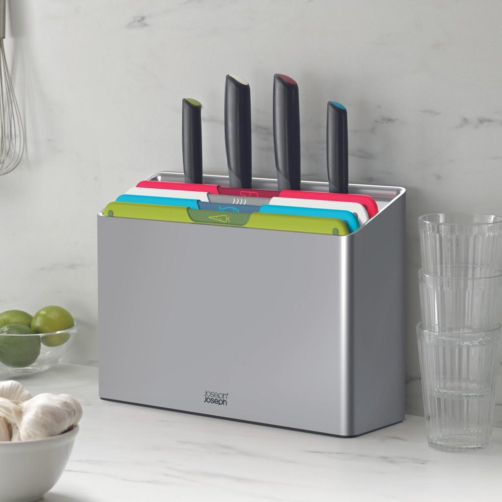 - Das Joseph Joseph FOLIO ICON PLUS Set kombiniert 4 Schneidebretter und 4 Küchenmesser in einem kompakten Ständer, sodass Sie alles, was Sie für die Zubereitung von Speisen benötigen, übersichtlich an einem Ort aufbewahrt haben.