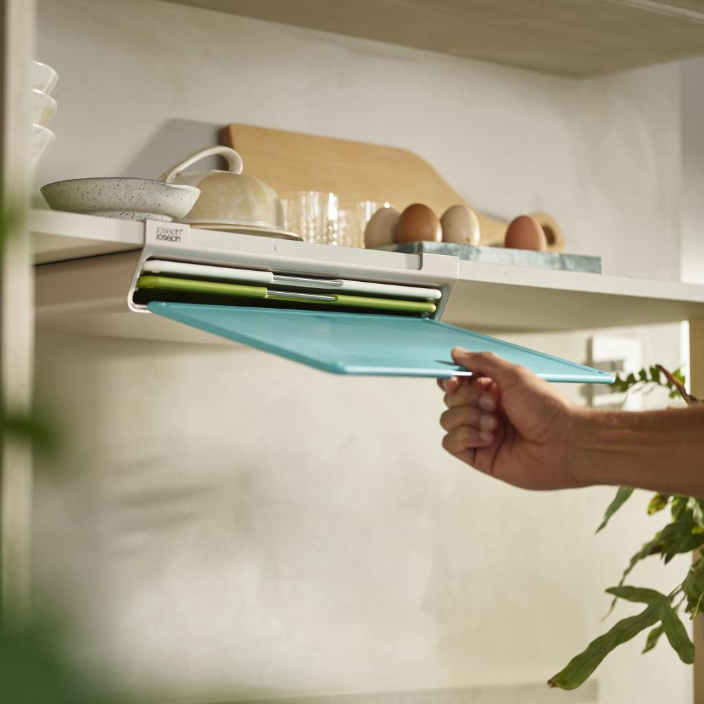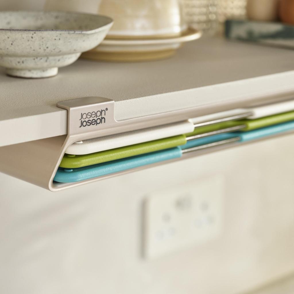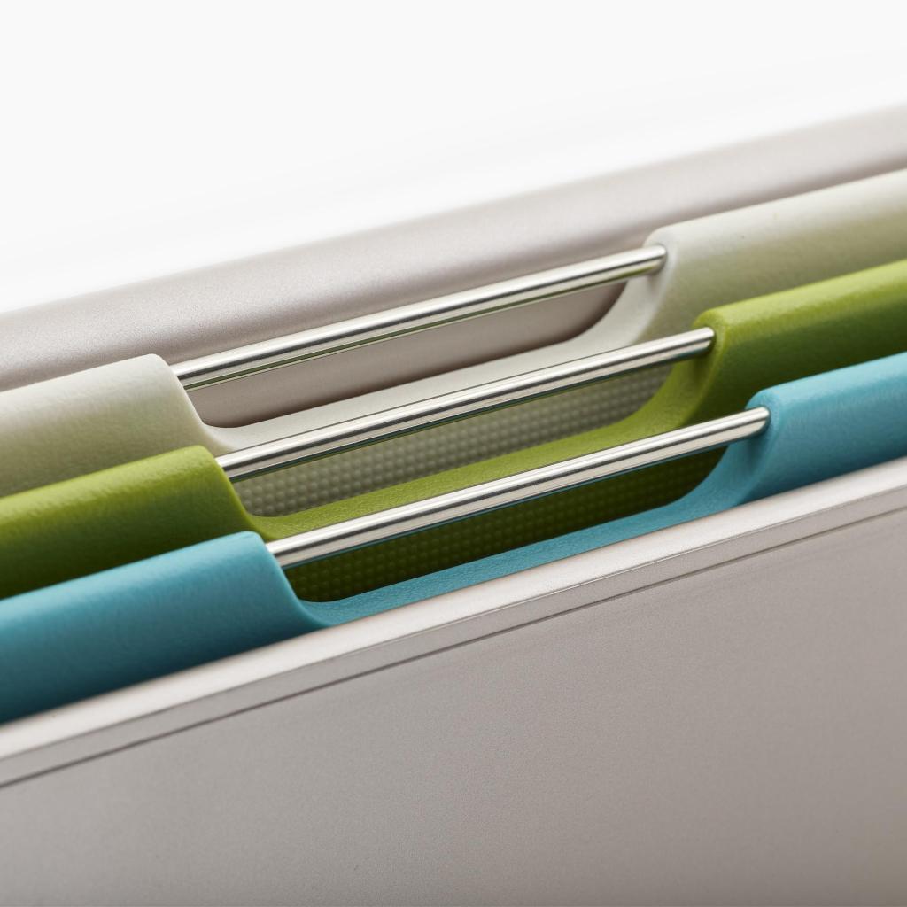 - Das Joseph Joseph FOLIO SLIM Schneidebrett-Set bietet eine praktische Lösung für die Zubereitung von Lebensmitteln und ermöglicht gleichzeitig die Aufbewahrung der Bretter unter einem Küchenschrankregal, sodass die Arbeitsfläche frei bleibt.