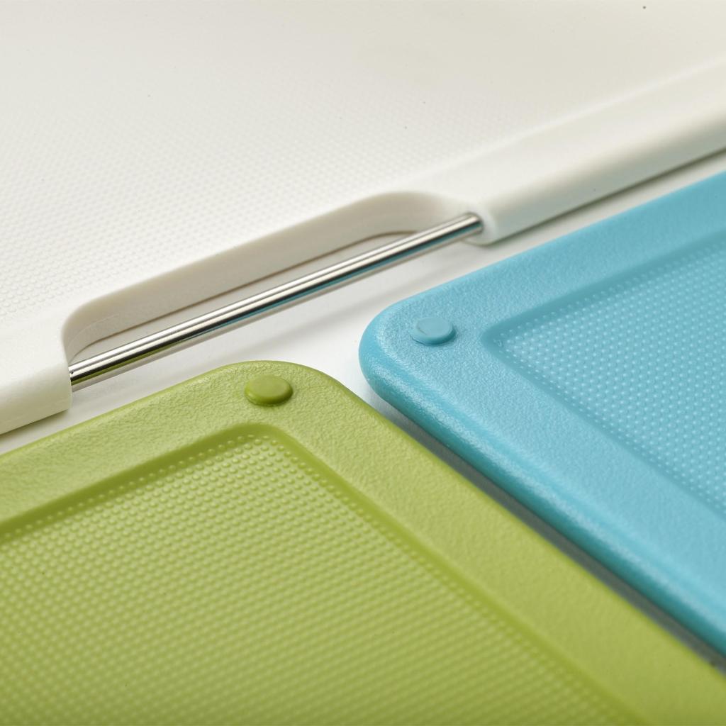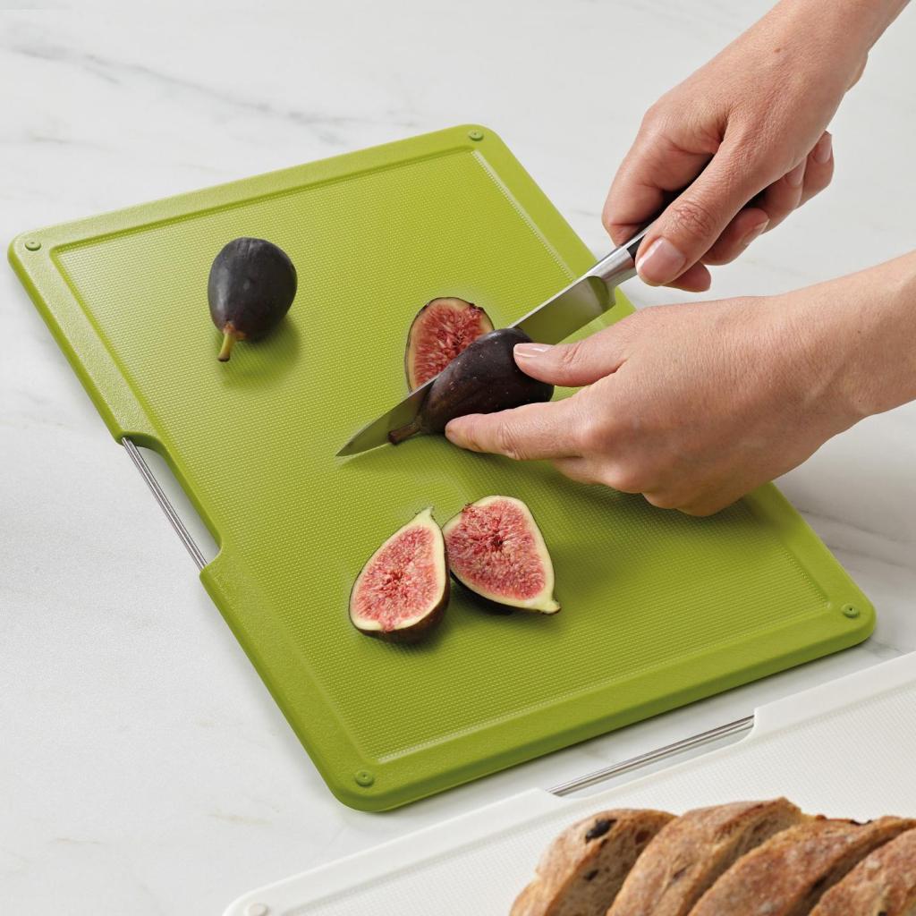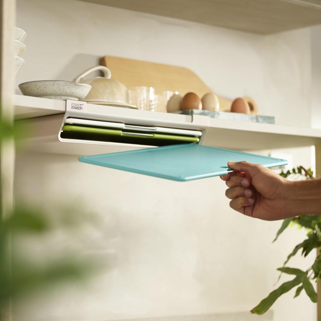 - Das Joseph Joseph FOLIO SLIM Schneidebrett-Set bietet eine praktische Lösung für die Zubereitung von Lebensmitteln und ermöglicht gleichzeitig die Aufbewahrung der Bretter unter einem Küchenschrankregal, sodass die Arbeitsfläche frei bleibt.