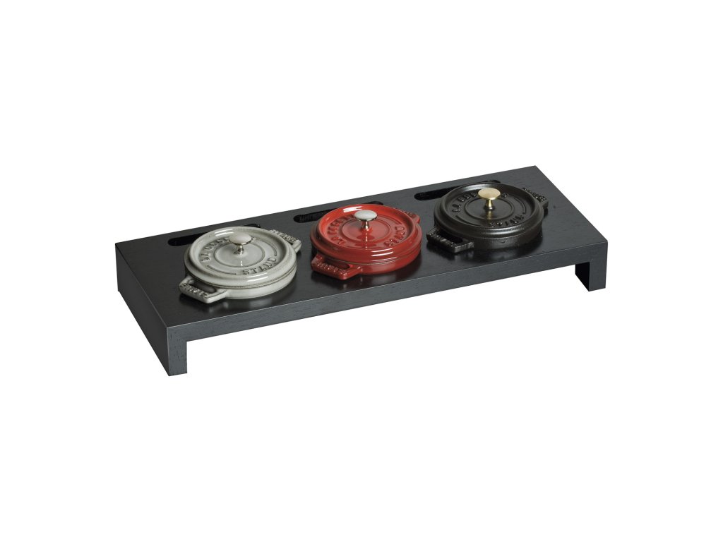 Serviergestell aus Holz für 3 gusseiserne Minitöpfe des Typs "Cocotte" des französischen Herstellers Staub in schwarz kann zum stilvollen, praktischen und sicheren Servieren von Speisen aus Minitöpfen der gleichen Marke mit einem Durchmesser von 10 cm verwendet werden.