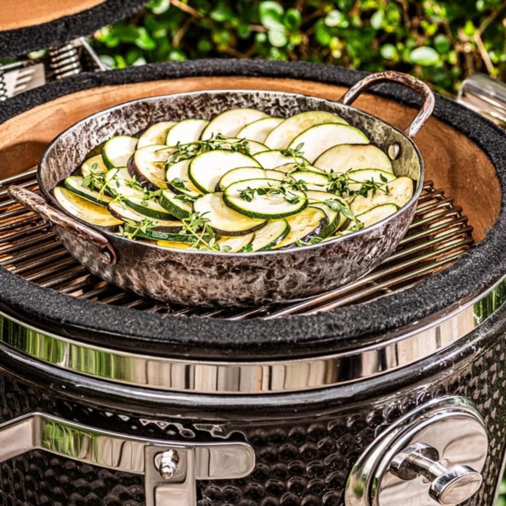 - Die Pfanne eignet sich für alle gängigen Wärmequellen, von Gasherden über Induktions- und Keramikherde bis hin zum Backofen BBQ und offenem Feuer.
