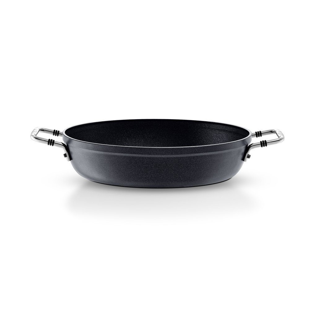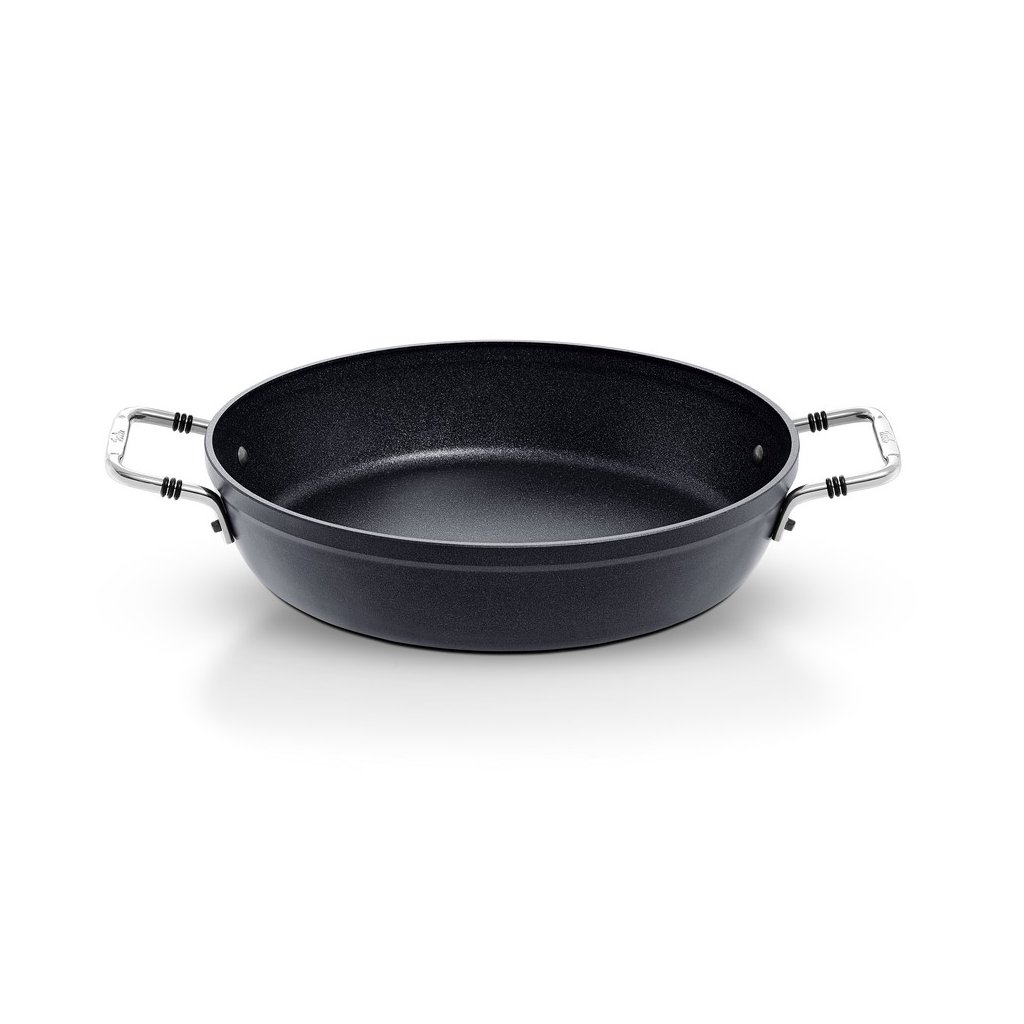 Die robuste Pfanne mit einem Aluminiumkörper von 28 cm Durchmesser ist ideal für feines und knuspriges Braten. Es hat eine Antihaft-Oberfläche mit Siliziumkarbid-Partikeln, die kratzfest ist - man kann sogar Metallutensilien darauf verwenden, ohne die Oberfläche zu beschädigen.