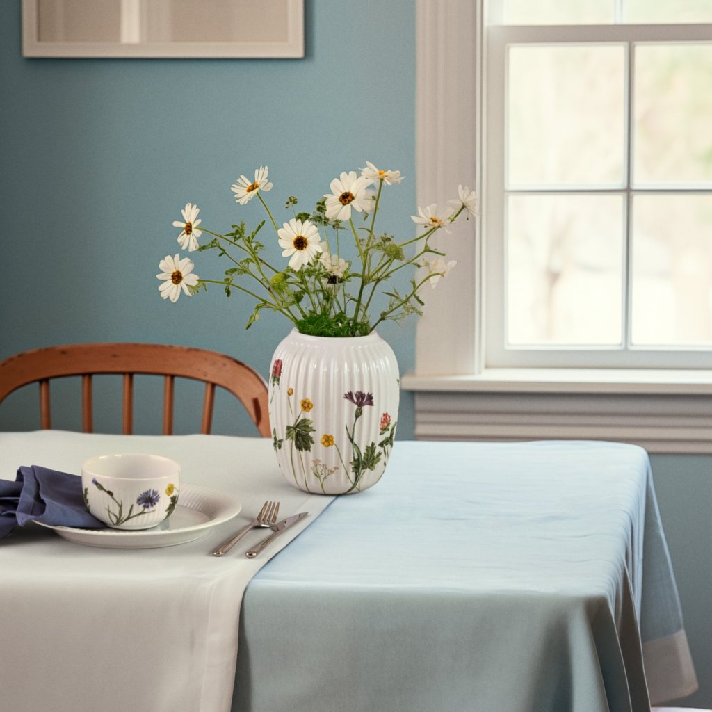 - Zarte Aquarellblumen wie Mohn, Klee oder Kornblumen vermitteln den Eindruck einer blühenden Sommerwiese und bringen natürliche Poesie auf den Tisch