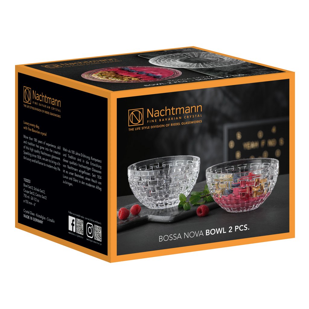 Das 2er-Set runder Schalen aus der Kollektion Bossa Nova überzeugt auf Anhieb. Die Serie bietet Kristallgeschirr und -accessoires, die so verführerisch und fesselnd für die Sinne sind wie die Musik und der Bossa-Nova-Tanz selbst. Die klaren Formen der einzelnen Glasstücke werden durch ein geprägtes Strickmuster belebt, das dazu einlädt, sie zu berühren. In der Bossa Nova-Kollektion des deutschen Herstellers Nachtmann verbirgt sich ein Charme, der unbewusst dazu anregt, etwas länger mit seinen Freunden am Tisch zu sitzen und die gemeinsame Zeit zu genießen.